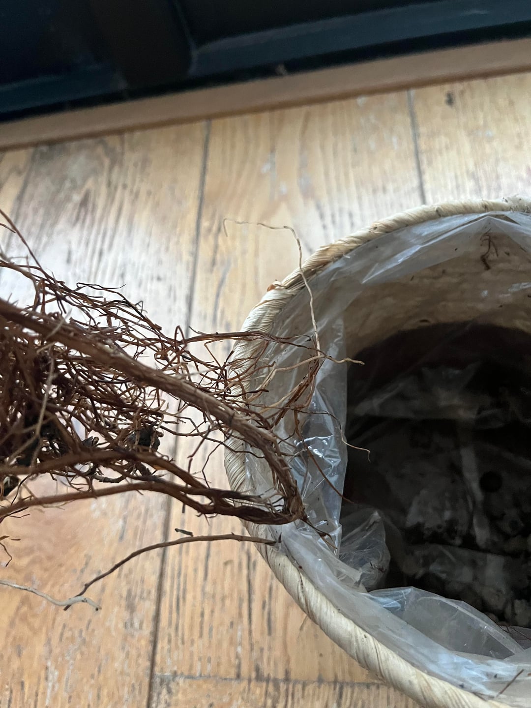 If you want to keep the plant in that basket, I suggest tearing that plastic lining out. It’s going to cause you moisture issues.