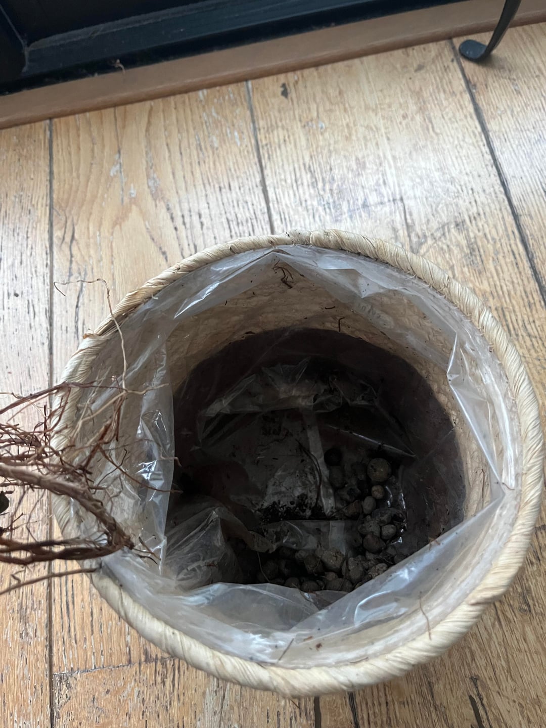 The outside pot has some stones in and a plastic bag but the roots feel very damp as the plastic traps any moisture.