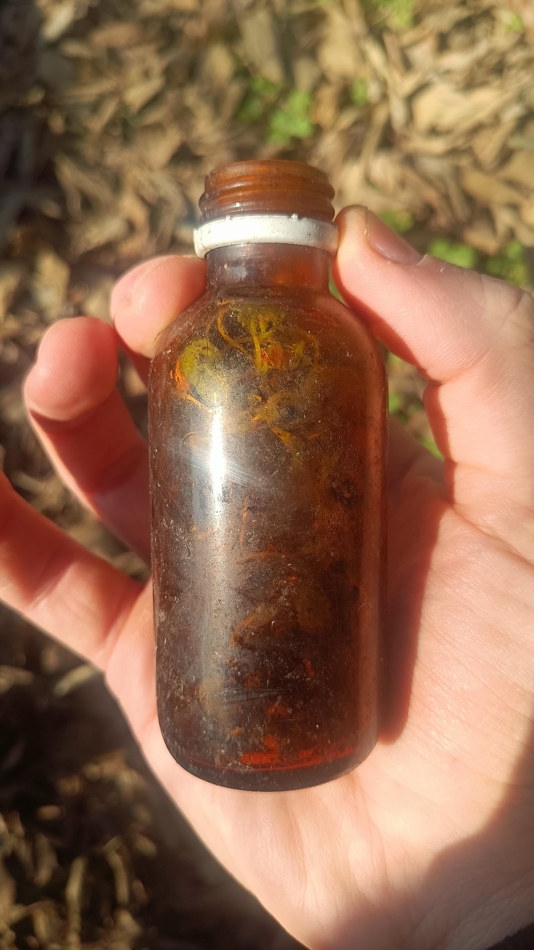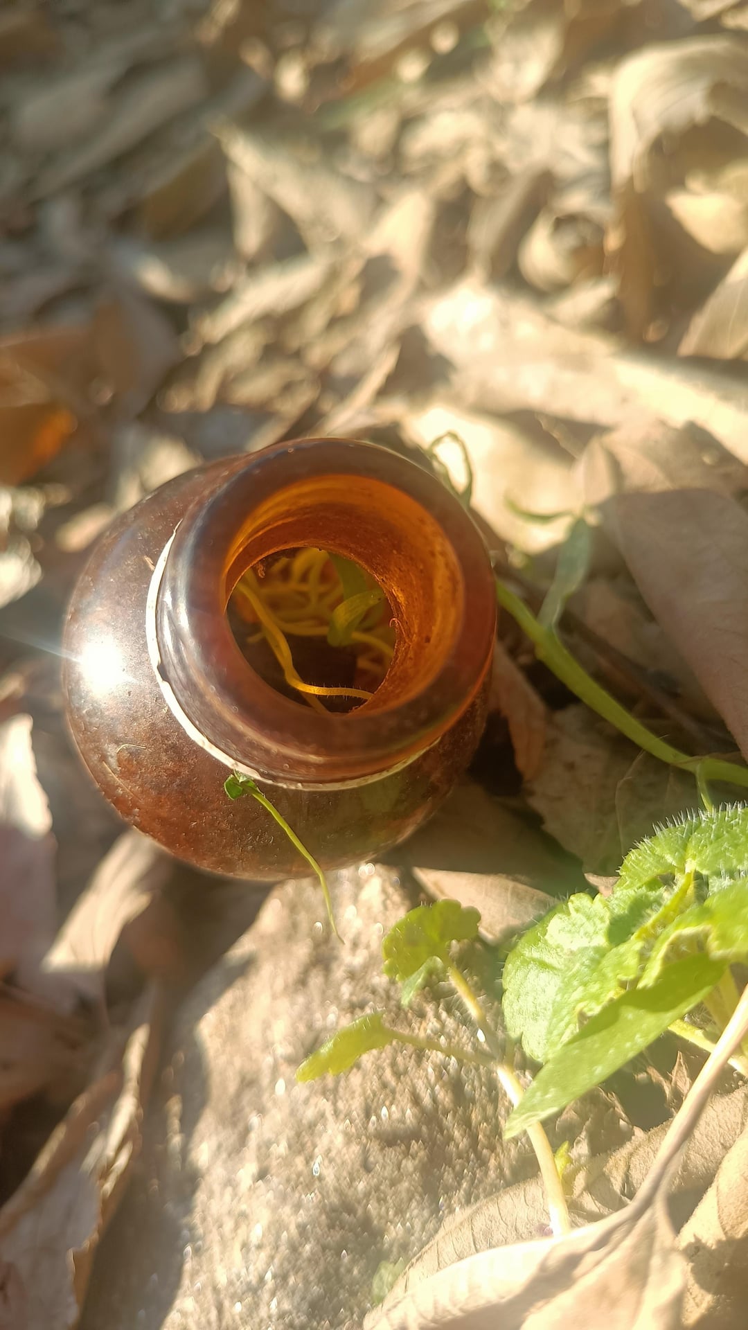 Small plants have grown inside thanks to the deposit of soil and pebbles. I think it's important to protect these finds (even if it's glass waste), so I decided to put it back after taking the photos for documentation.