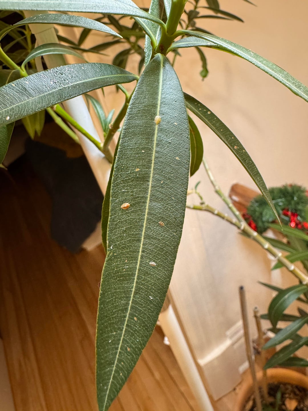 She has a mini Oleander tree plant and I noticed recently there's these weird somewhat flat dots/growths on several of the leaves.