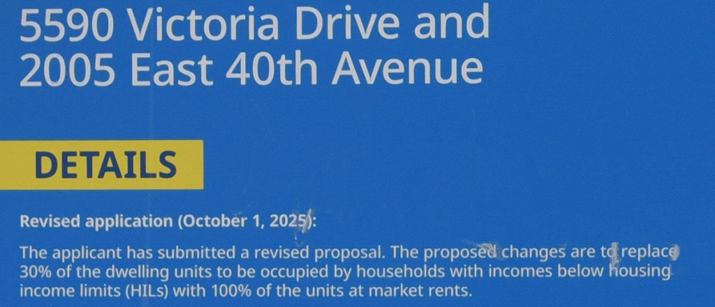 Rezoning sign at 5590 Victoria Drive. The property has an approved CD-1 rezoning already four years ago in 2021. A new rezoning seeks to remove the requirement for 30% of the rental units to be offered at below market rates (HILs). The developer instead seeks 100% market units. The community garden on the site serves as a tax break, estimated at $28,800 in 2025.