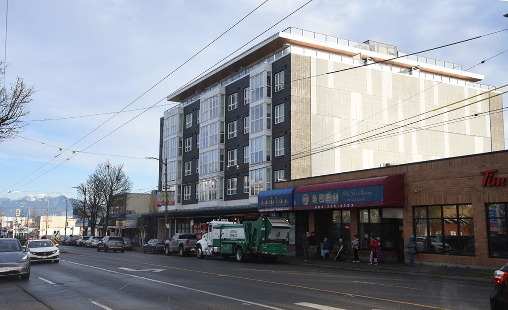 A 6-storey building at 5656 Victoria Drive. There is a Vancity branch at retail level (contrast with other sections of Victoria Drive that contain many small storefronts).