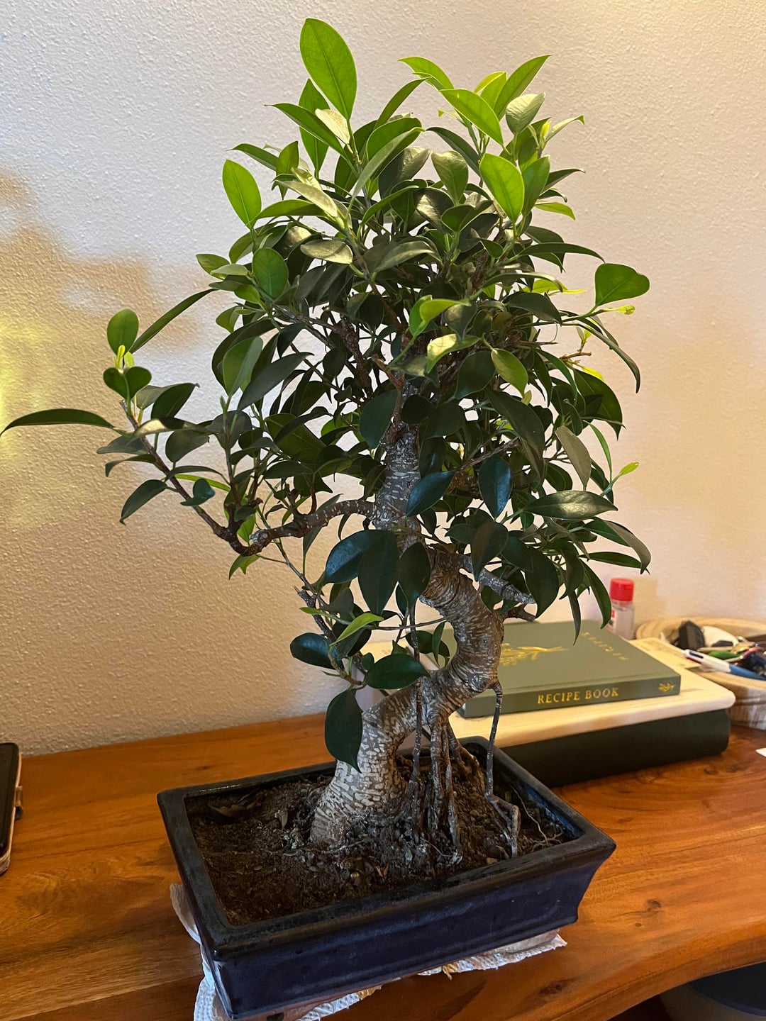 I received this Ficus Retusa(I think?) bonsai for Christmas. Although I have a good deal of experience with houseplants, I don't know much about bonsai. I really like this plant, especially for the aerial roots it has developed. However, I think the top part is a bit bushy and should be pruned. Do you agree? What do you think I should do?
