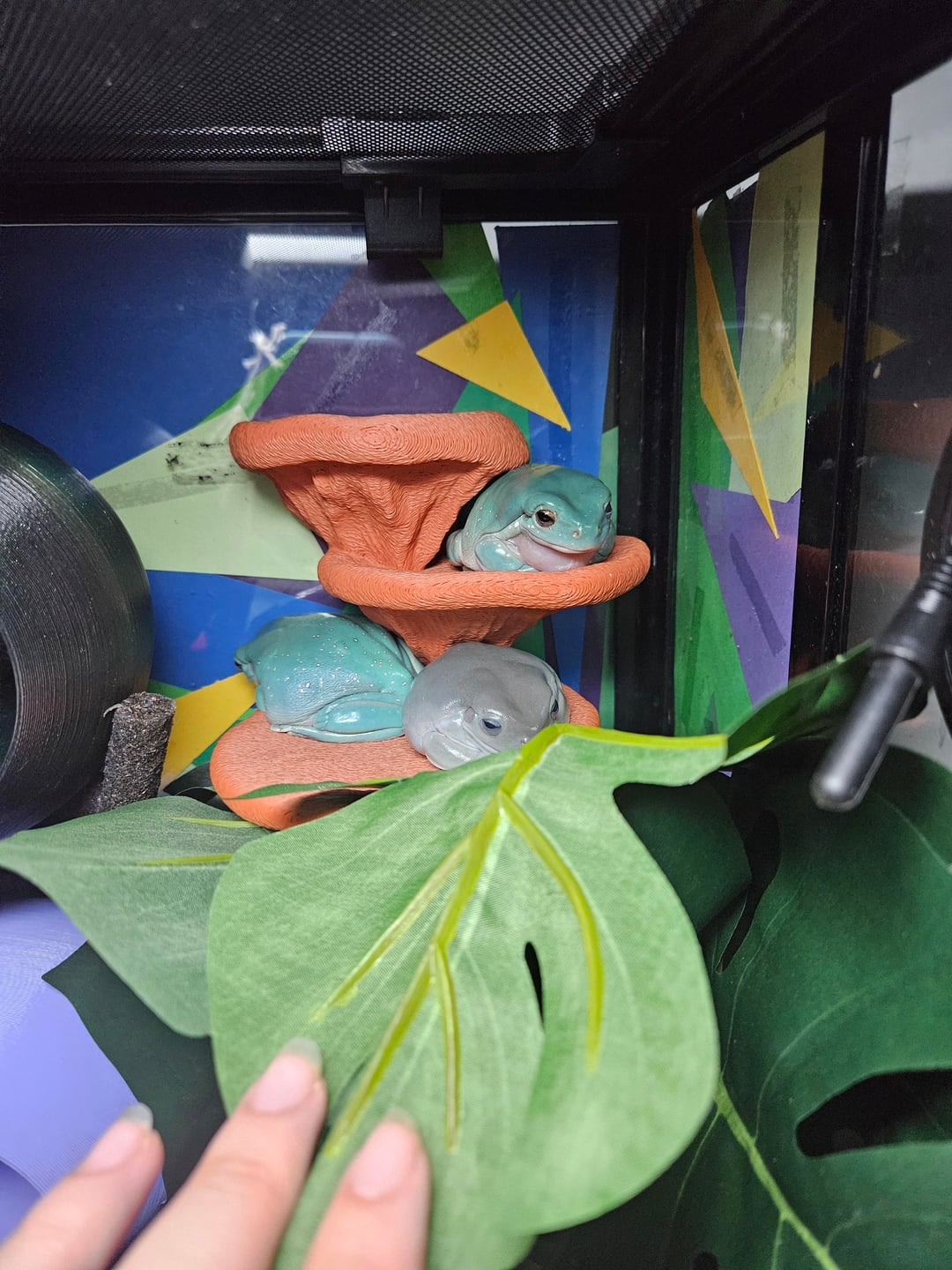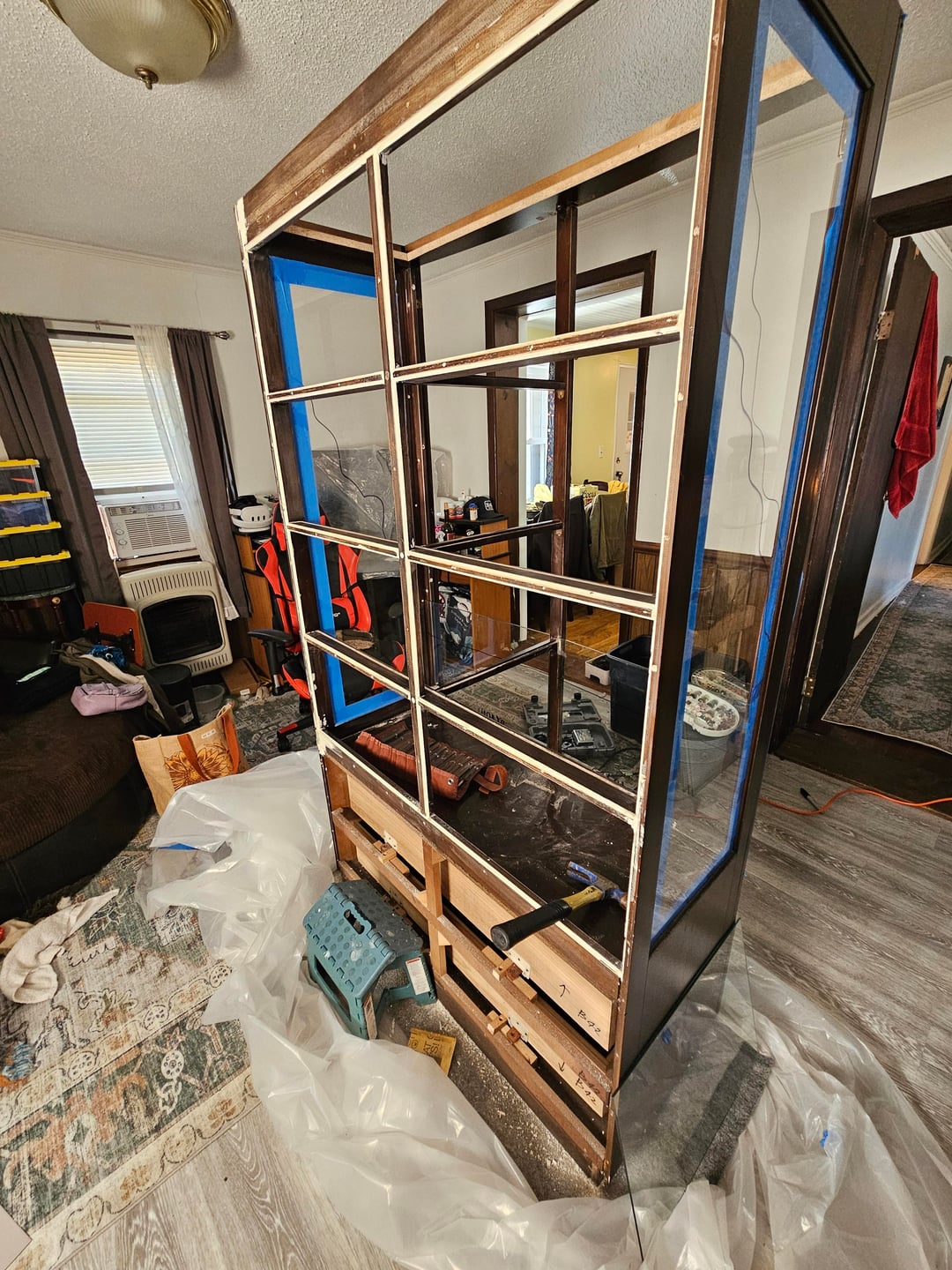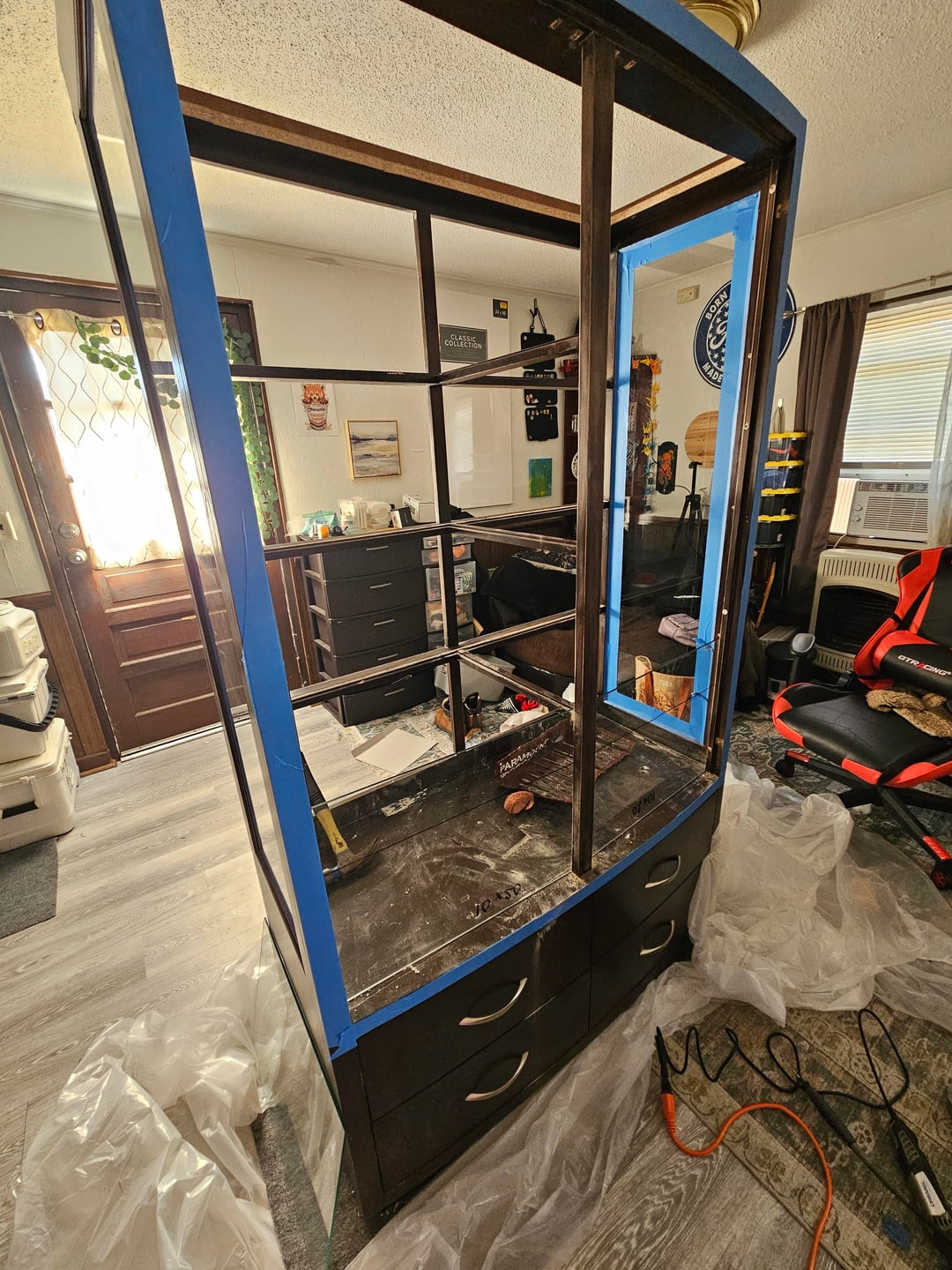 So the plan really keeps changing, this is my first vivarium….so basically everything has been sanded just enough to remove the shine, its going to be coated in pond liner, then caulked with aquarium safe stuff, we're going to have a thicker plywood backing painted then also caulked onto the back… then for this horribly dreadful bottom im at a little bit of a loss for… so the glass we have is tempered so it cannot be cut. For my pocket and the needs of my frogs, im just going to have an ugly really high substrate glass front… so for the bottom I want to get rid of the edges that could hold water so I will be tilting the whole cabinet lol and pouting a 2part epoxy resin bottom. Have no fear its non toxic and will only go about 2-3 inches high. If youve made it this far into my book feel free to put you input in on this so far. (Half of my clan just bc they cute💚 )