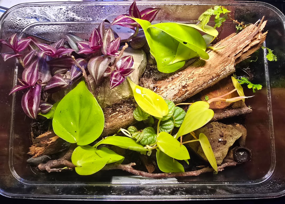 2.plants in build (preferred scientific name instead of nickname): Tradescantia zebrina, Lemon Lime Philodendron, Peperomia, and moss