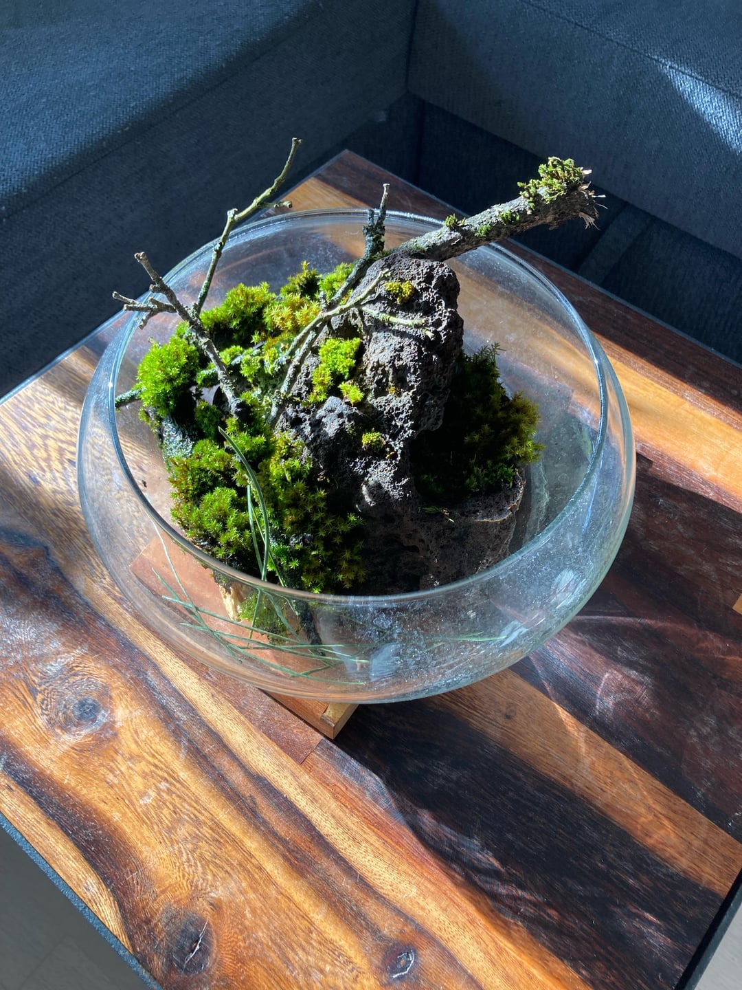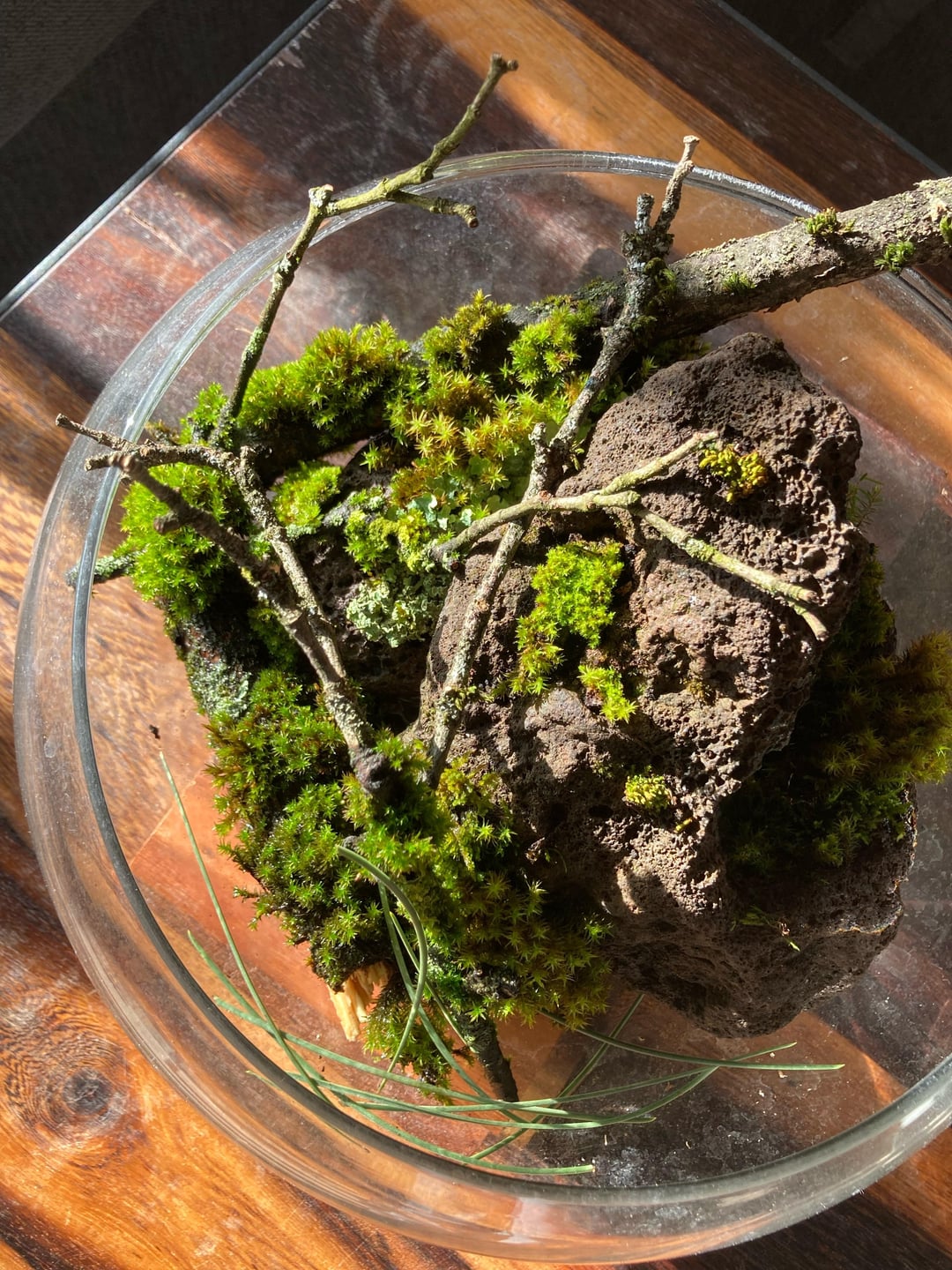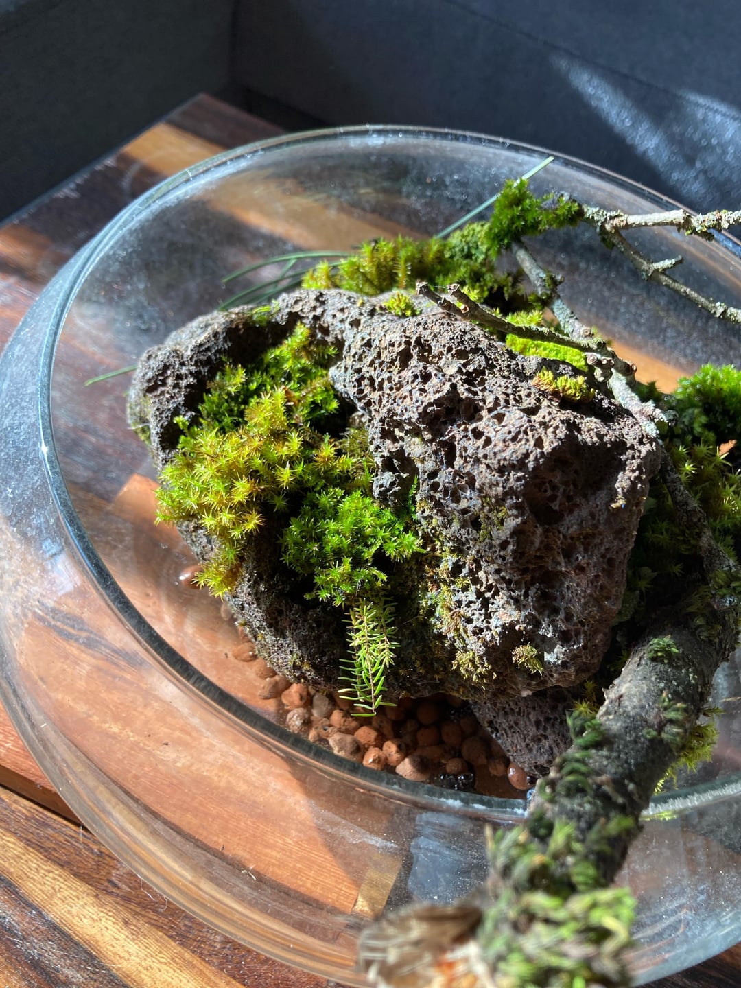 Found most of it on cut down branches. In cut the moss of with some bark attached and placed this on a tiny bit of soil on this lava rock.