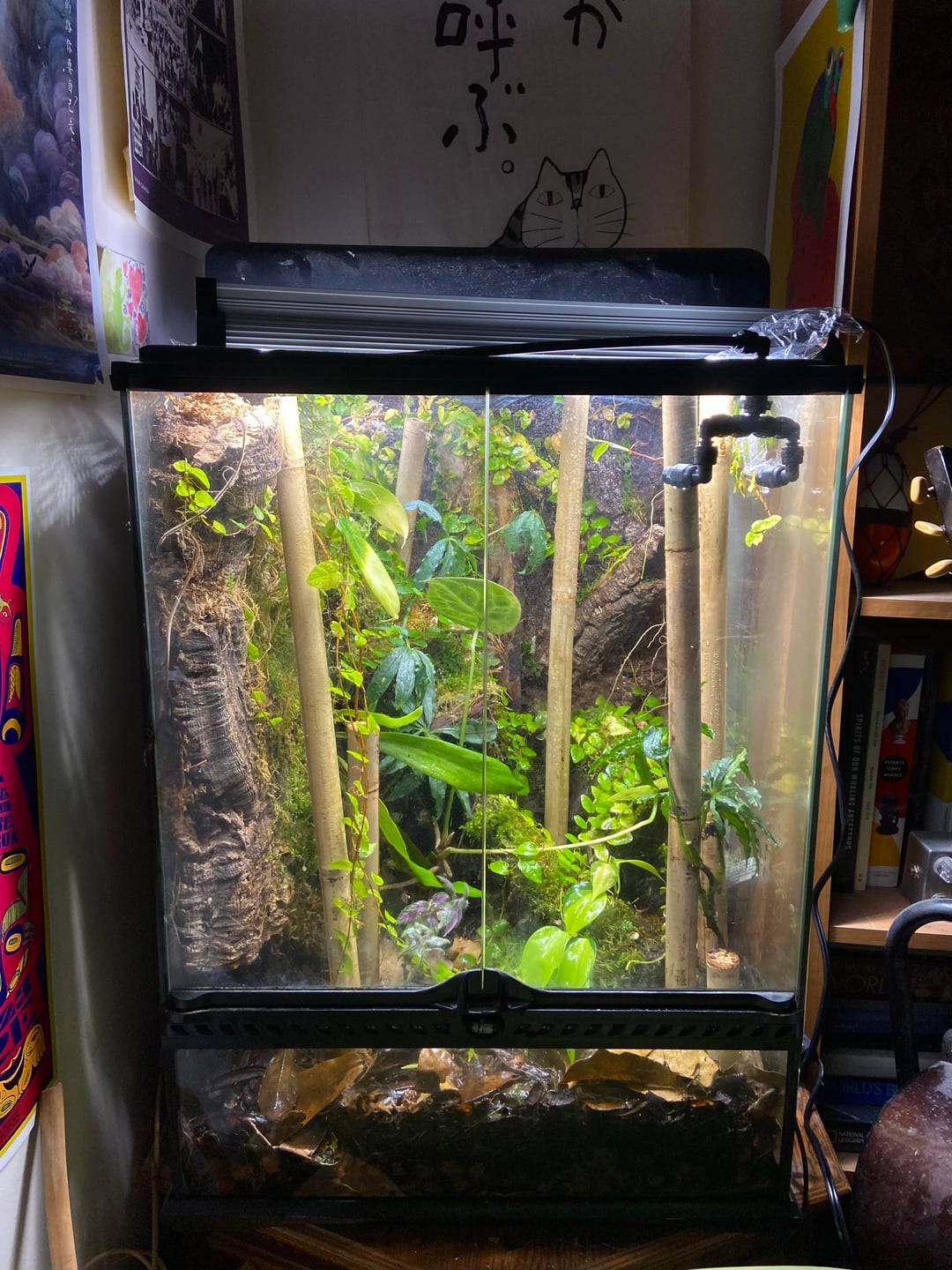Adding some finishing touches to the bamboo-forest themed 18x18x24 Exo Terra vivarium I set up for a pair or trio of Neon Day Geckos, Phelsuma klemmeri.
