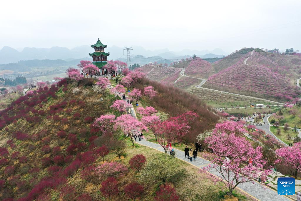 An aerial drone photo taken on Jan. 24, 2026 shows people visiting a plum blossom garden in the Guian New Area, southwest China’s Guizhou Province. Covering an area of 1,800 mu (120 hectares), a plum blossom garden opened to the public in Guian New Area on Saturday, attracting tourists for sightseeing. Once an ecologically fragile area, the garden has planted over 50,000 plum blossom trees. (Xinhua/Yang Wenbin)