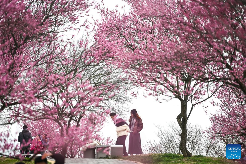 Visitors pose for photos at a plum blossom garden in the Guian New Area, southwest China’s Guizhou Province, Jan. 24, 2026. Covering an area of 1,800 mu (120 hectares), a plum blossom garden opened to the public in Guian New Area on Saturday, attracting tourists for sightseeing. Once an ecologically fragile area, the garden has planted over 50,000 plum blossom trees. (Xinhua/Yang Wenbin)