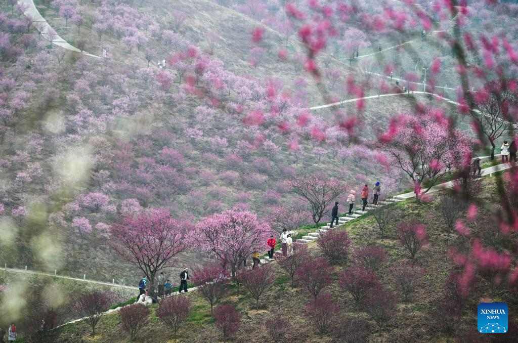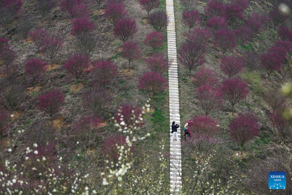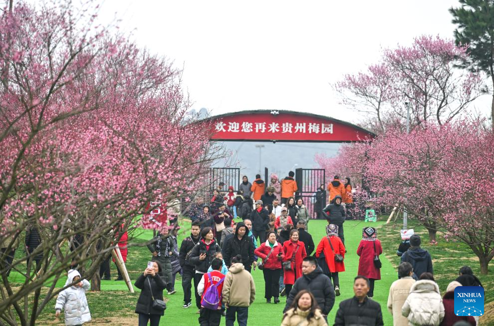 People visit a plum blossom garden in the Guian New Area, southwest China’s Guizhou Province, Jan. 24, 2026. Covering an area of 1,800 mu (120 hectares), a plum blossom garden opened to the public in Guian New Area on Saturday, attracting tourists for sightseeing. Once an ecologically fragile area, the garden has planted over 50,000 plum blossom trees. (Xinhua/Yang Wenbin)