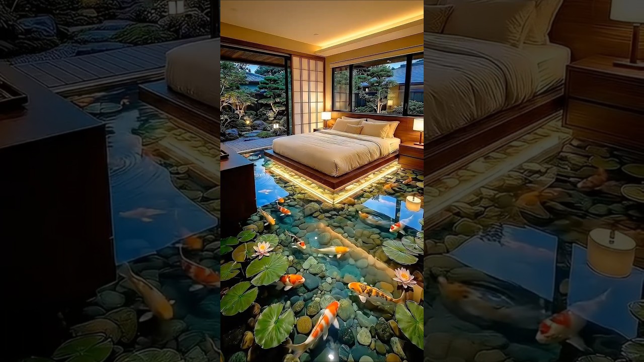 glass koi pond floor, koi bedroom design, floating bed platform, 3D epoxy illusion, epoxy resin art, artistic flooring, epoxy transformation, epoxy floor decor, epoxy floor inspiration, epoxy floor masterpiece, epoxy floor illusion, epoxy floor creativity, epoxy floor innovation, luxury bedroom design, Sarah’s Creativity, Zen interior design, Japanese garden bedroom, immersive interior design, koi themed decor, biophilic interiors