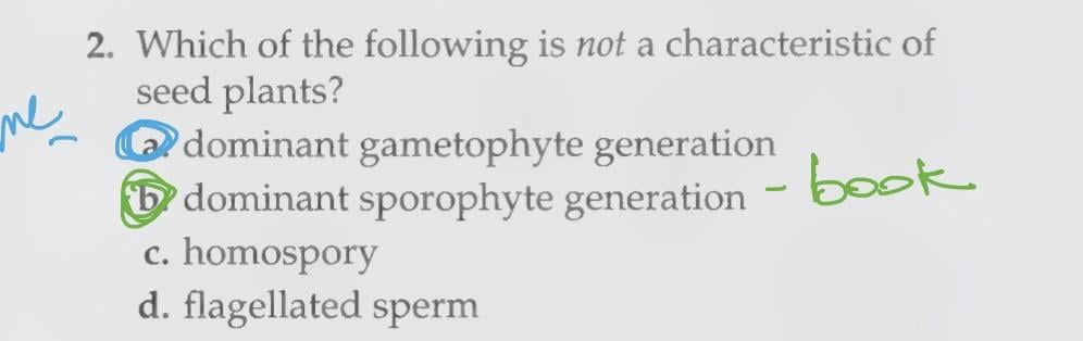 Question asked which is NOT a character of seed plants. Which on the list is not found in seed plants, which would include both gymnosperms and angiosperms. “A” is the correct answer. Show your instructor the book.