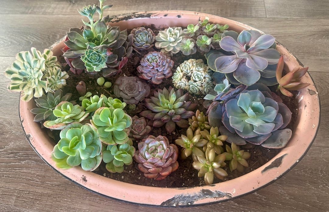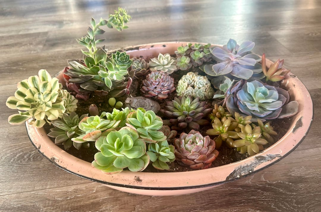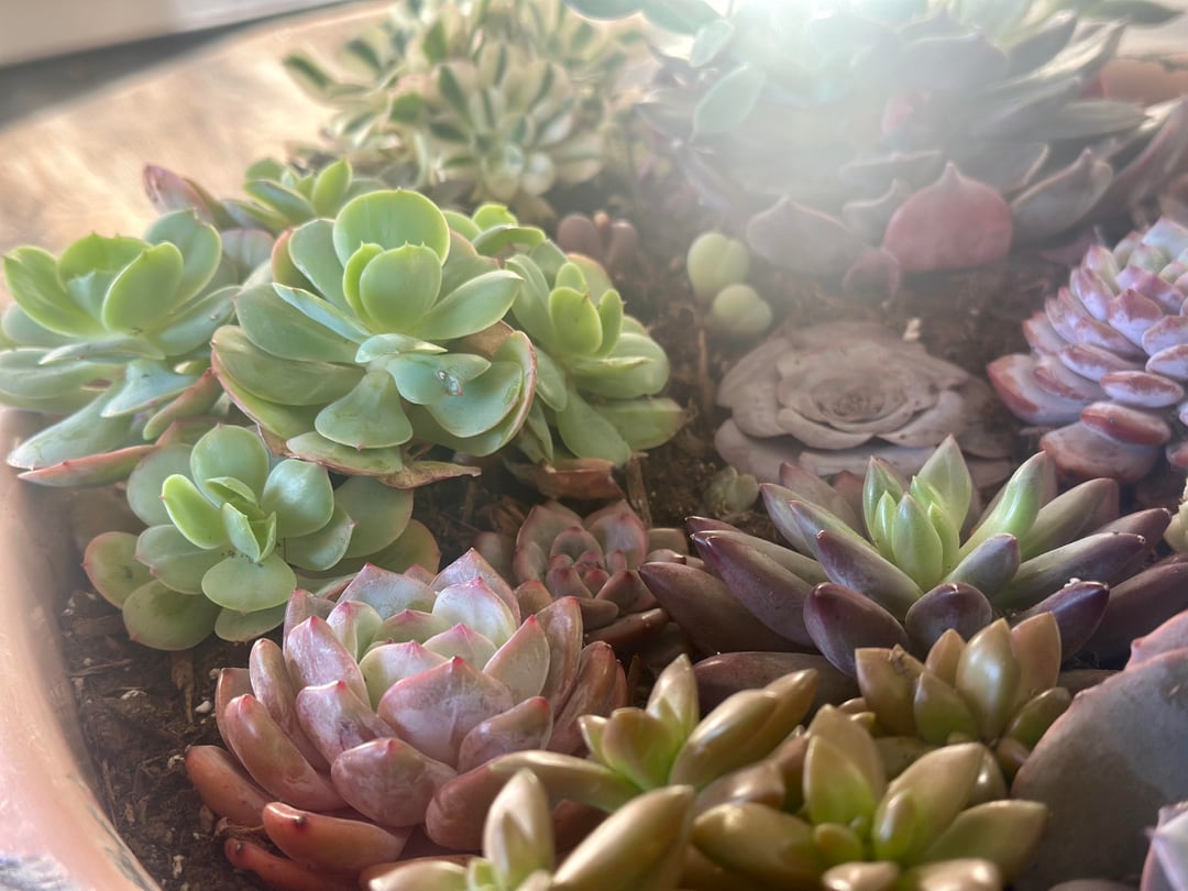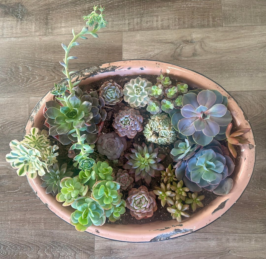 I love plants & creating with them-this is my vision of a tub of succulents that look like flowers/rosettes. They were all a lot smaller when this was made a month ago, I kinda threw starters together & watched them to see what would happen. They are doing good for now, my hopes & questions for discussion with yall are:
