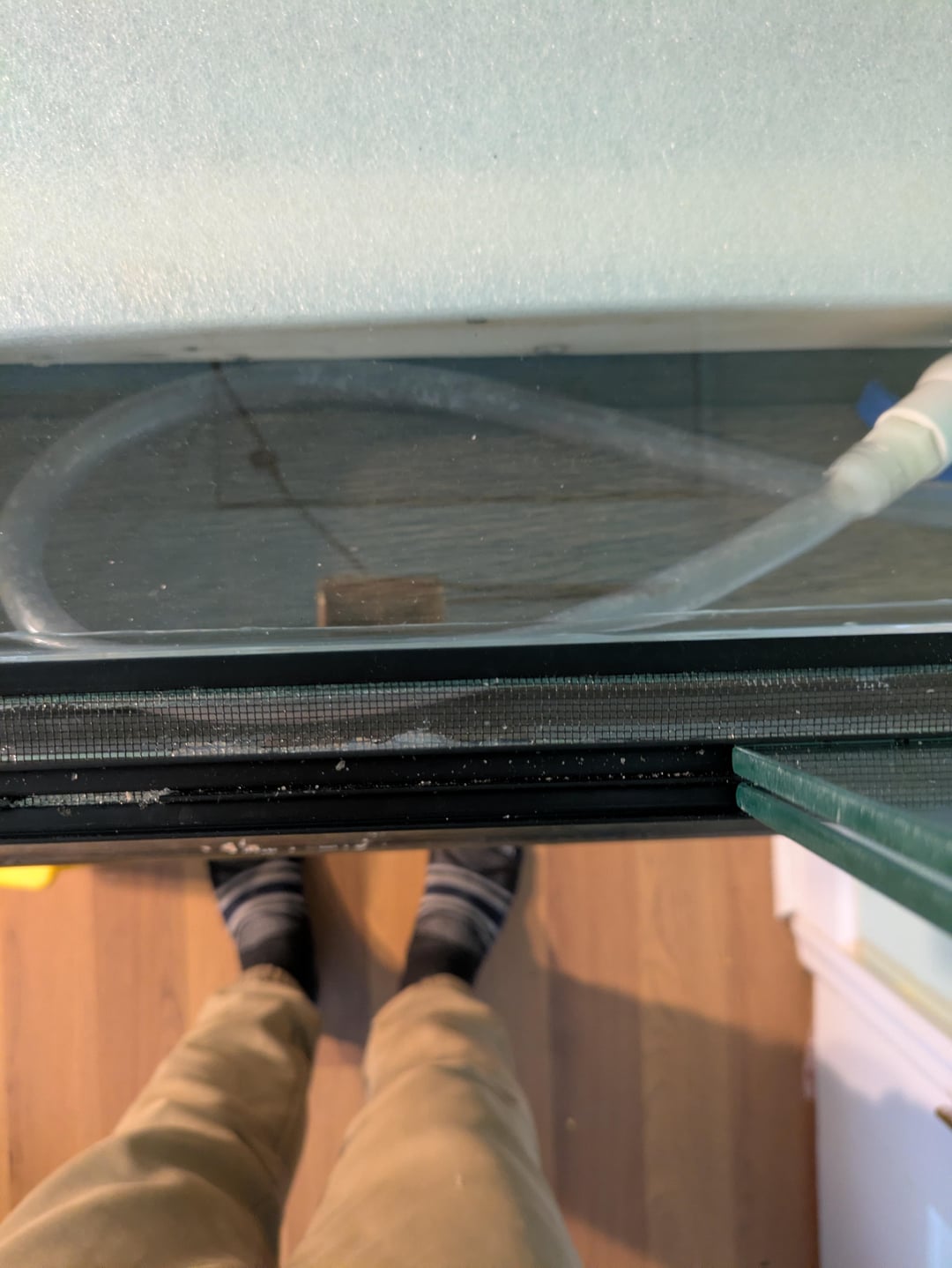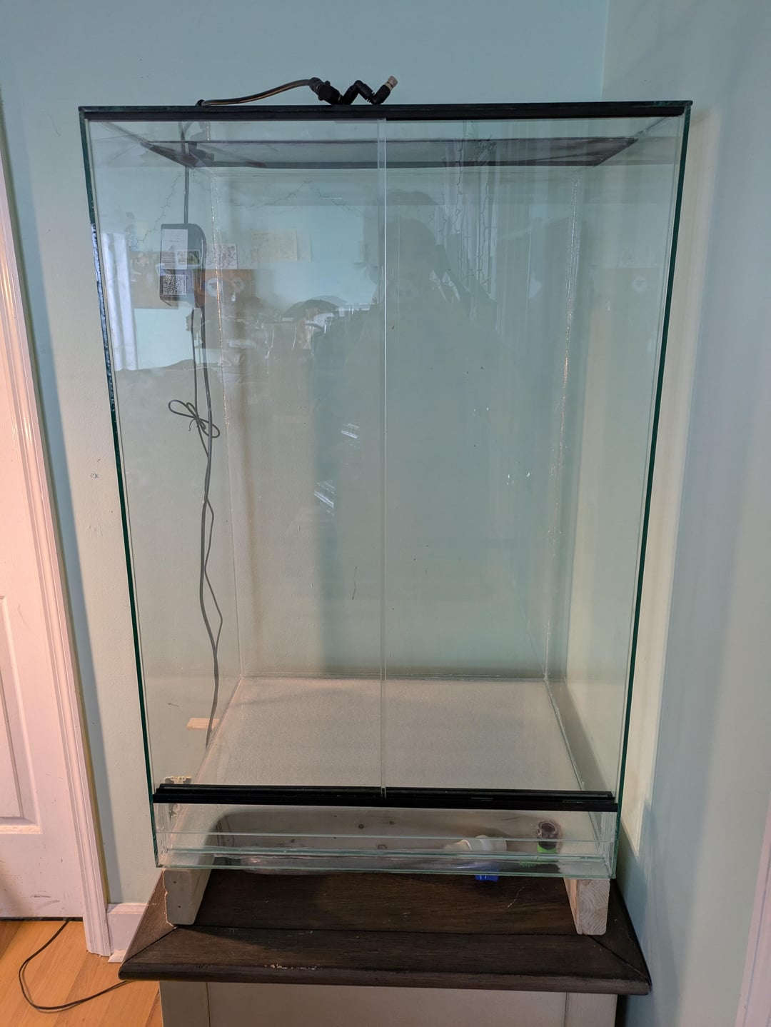 Measurements are 20x24x36", made using the "Eurostyle v2" template from Troy Goldberg with some modifications to measurements. Bottom drained via a 3/4" bulkhead for ease of operation. The sliding glass tracks are homemade from styrene L-braces, which in hindsight was actually more expensive than using real tracks 😅