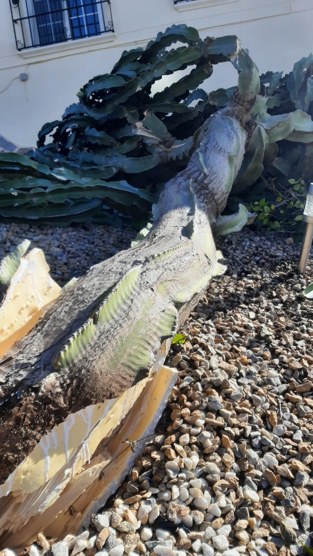 Due to rain and the strongest wind we've experienced in a long time, this giant plant in oyr garden has ripped/cracked at the base and dallen over. Does this plant have any chance of survival whatsoever if somehow being able to be planted back deep enough into the ground?
