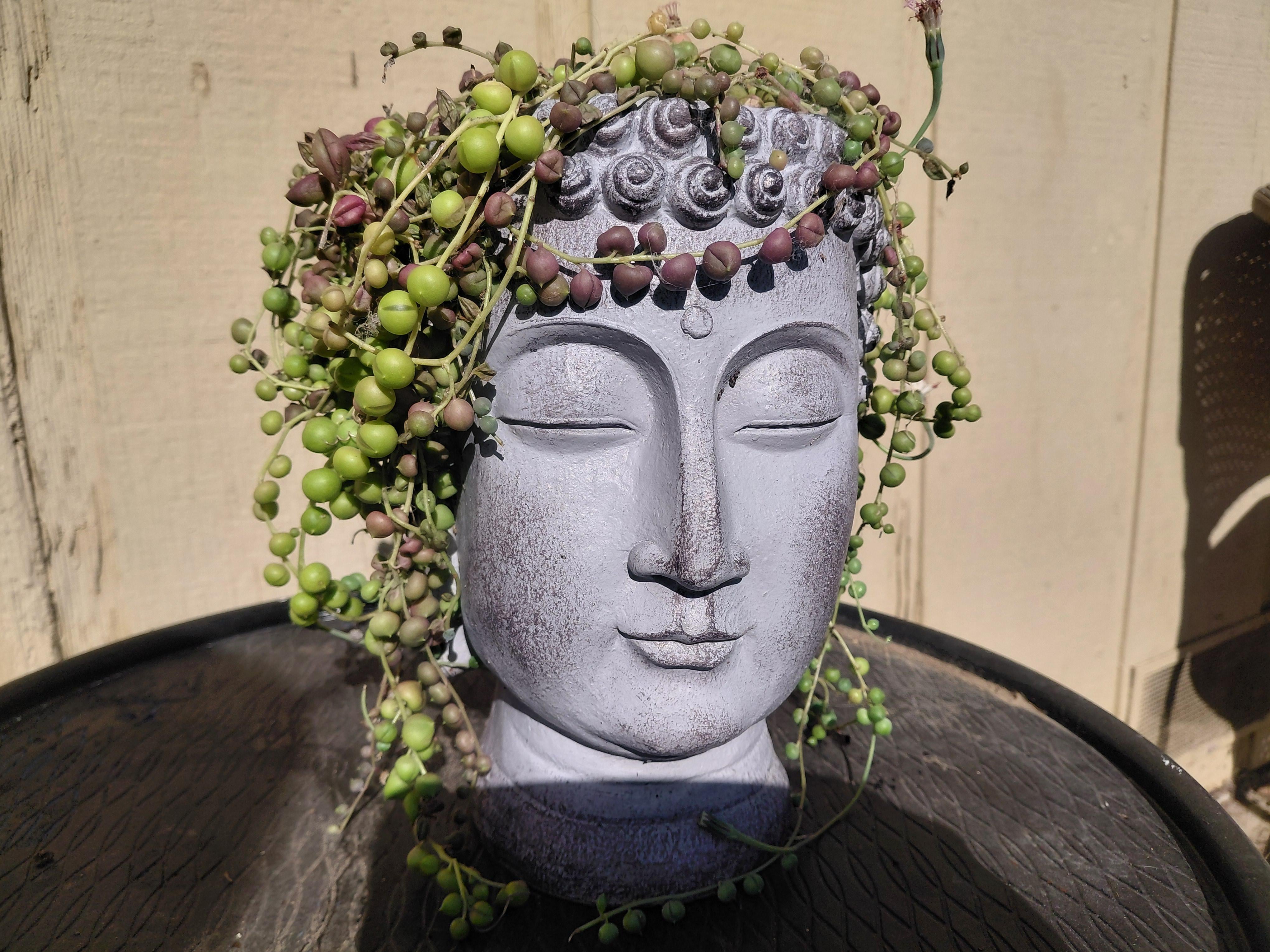 Isn’t that Buddha? Really interesting pot, though. My mom’s got a big resin Buddha on the porch and when she puts her plants out in spring around him, they always seem to want to hug him with their arms. Isn’t too long before all you can see is his head.