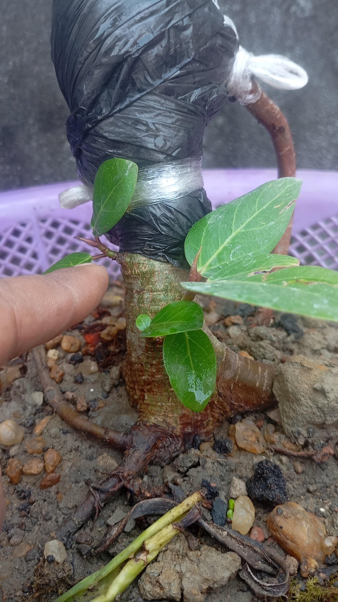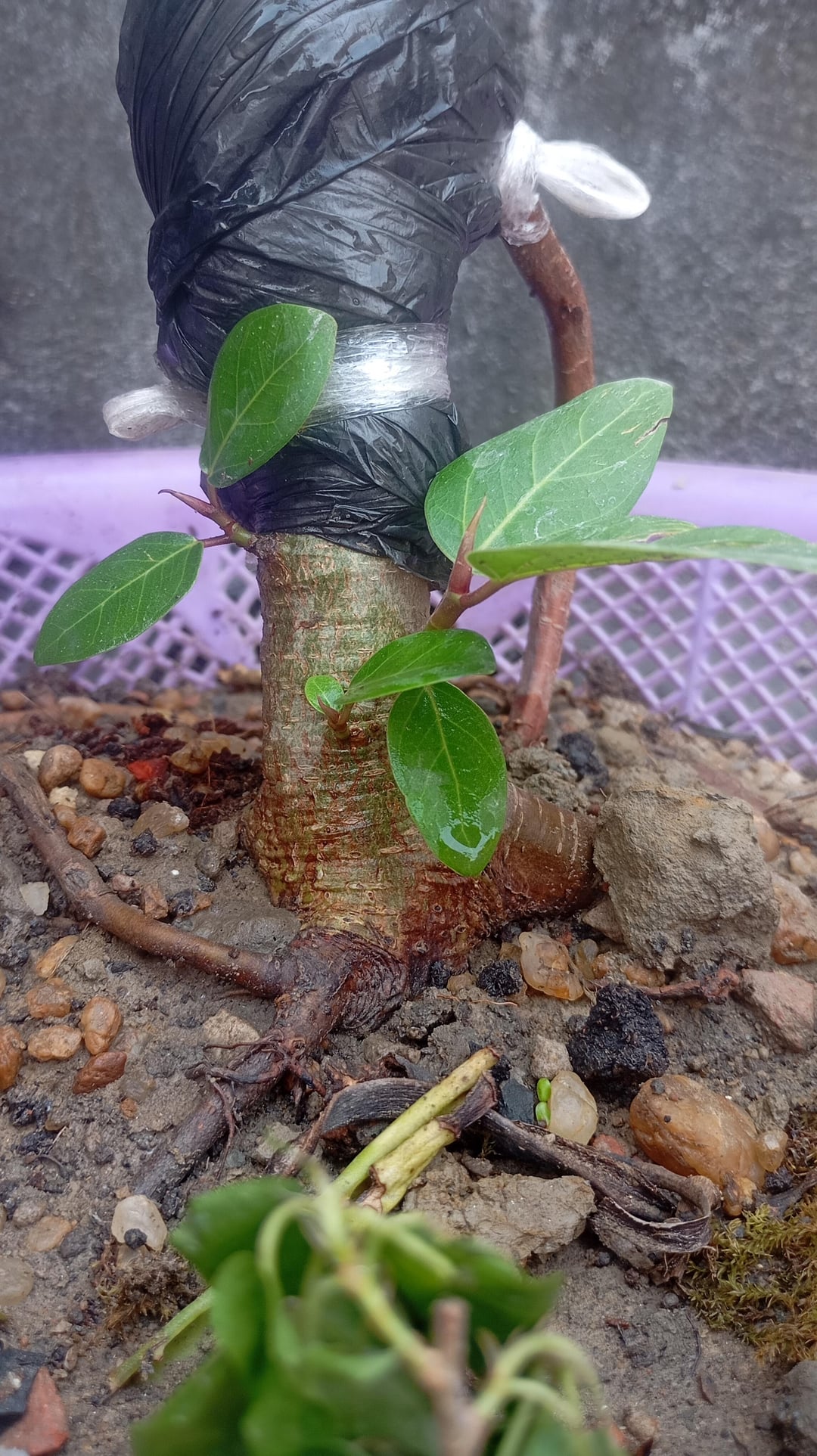 This is a Ficus benghalensis, and they are notoriously telephone pole-ish as they try to reach up. I was planning to chop it right below the black plastic (air layering) to give that little branch to grow as primary and give the trunk some movement in the long run…