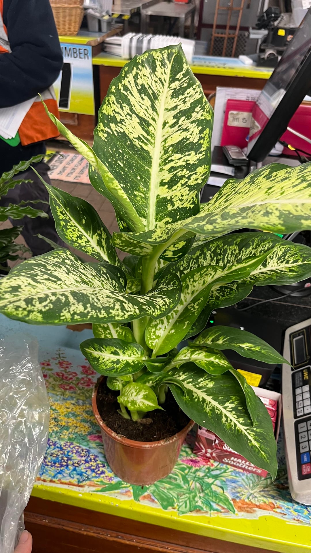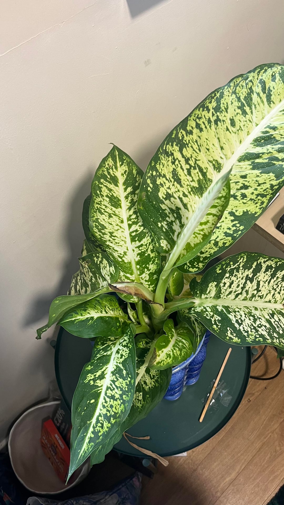 The plant is a dieffenbachia, I bought it from a garden centre on the 29th of December (shown on that day in the first picture). I have since had to take in on a crowded train, where it sustained some damage to a couple of leaves.