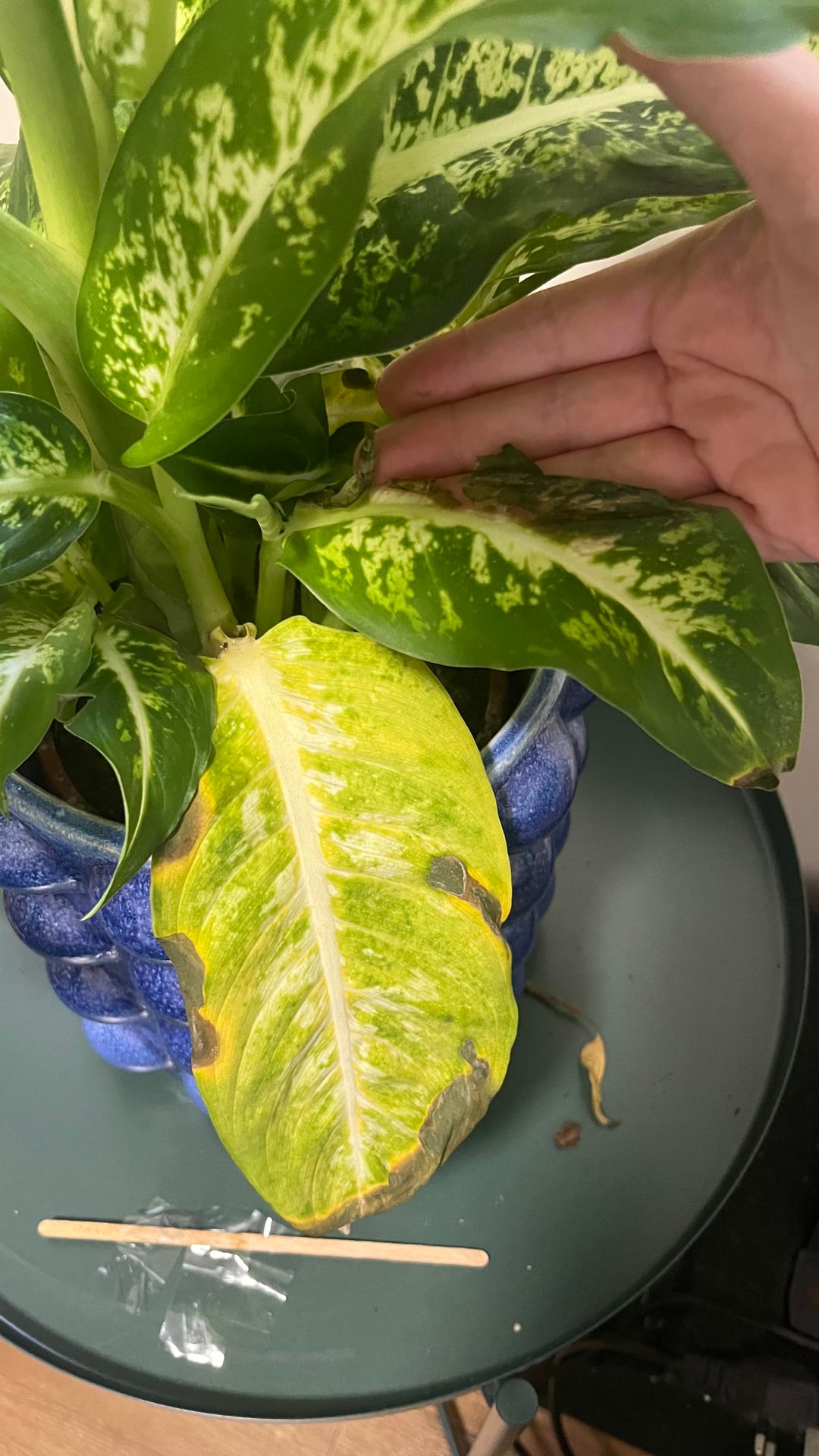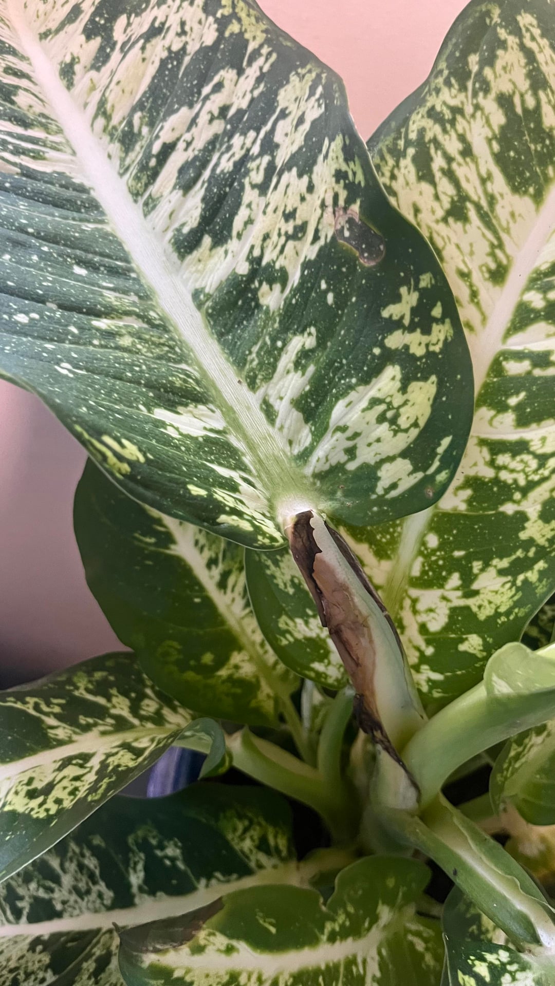 The first thing I noticed was the stem seen in the second picture had a small section of brown on the side about a week ago which I removed thinking it would be dry and crispy (I was thinking of the brown skin you get at the bottom of Monstera leaf stems, which I often remove) however it was wet and soft, and since then the brown section has spread across the whole stem, and upon turning and checking the plant I’ve found other leaves with soft brown sections at the edges, as well as a few dry brown circles on otherwise healthy leaves and one leaf completely yellowing.