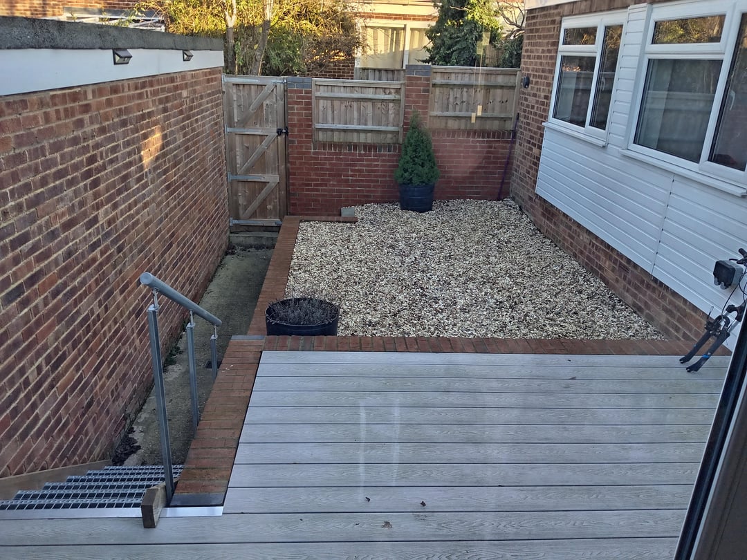 We have recently moved to a new house and it has an elevated Courtyard garden. We would like to keep the decking area but would like to have grass instead of pebbles. And it would be great to have the whole garden in level.