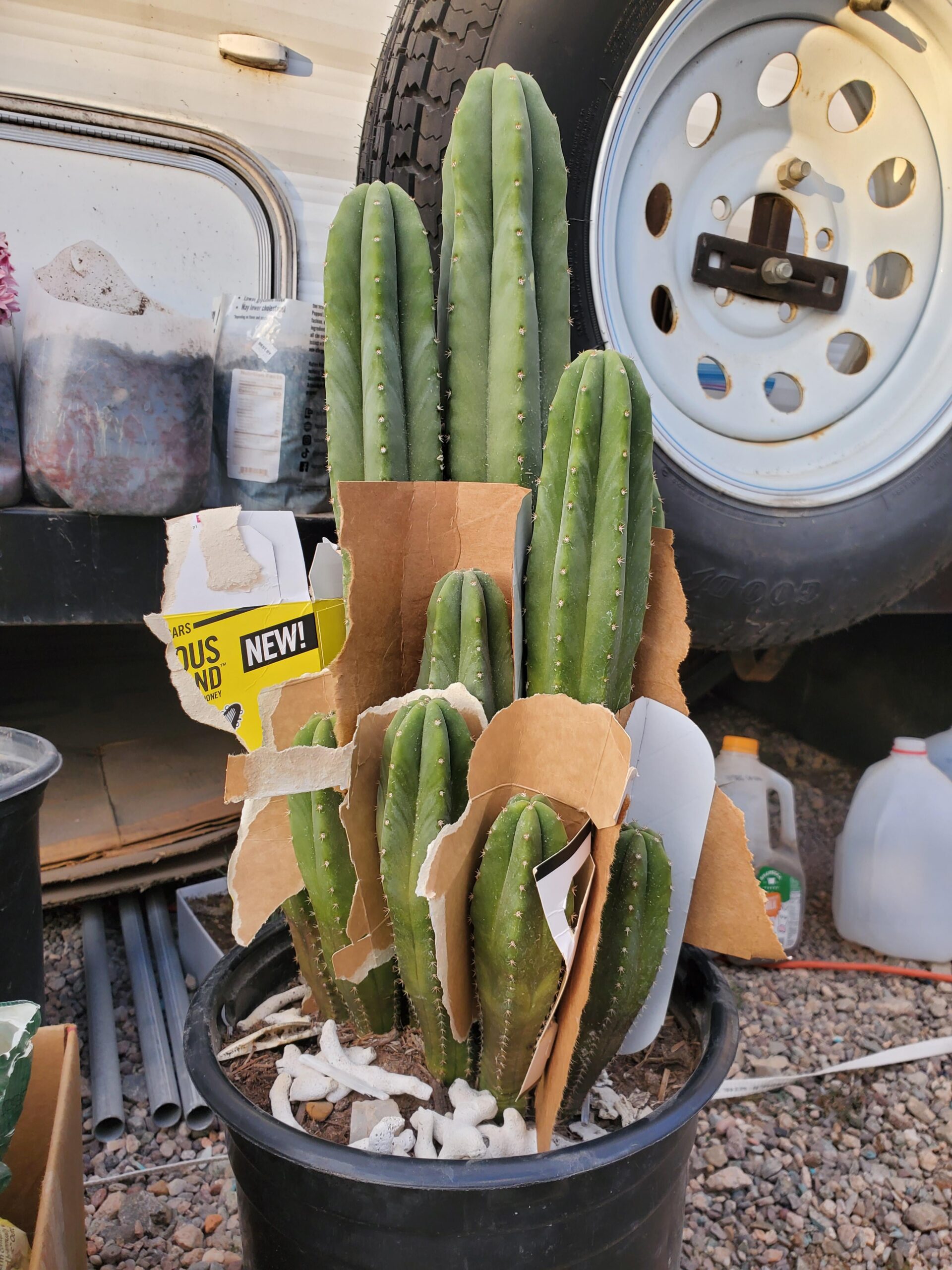 Dirt looks a bit organic, cactus probably doesn’t care too much at this point if it has a solid rootball. Hard for me to tell if pc or not, I don’t see “seagulls” over areoles and it is slightly saw toothed. At the same time, those “pups” look more like extra planted seedlings, so more likely a cluster of seed grown pachanoi NOIDS. Nice farina pattern.
