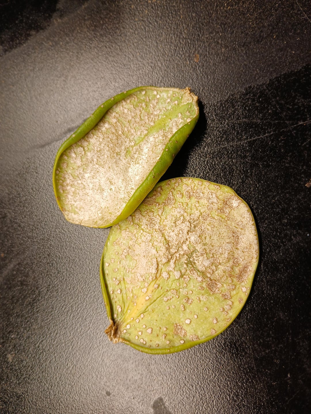 -a white crust developing mostly on the underside of the leaf, but also on the tops to a lesser extent