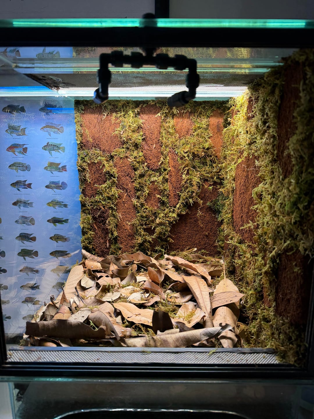 Haven’t kept frogs in 10ish years so no vivs either I use to just do Great stuff and silicion with coconut coir but wanted to try a new method with speaker fabric as my base and fern panels for more plant growing. Not sold on the hardscape this is an old piece I had in my aquariums. Let me know any critics you’d change or add to this! All my leaf litter is from betta botanicals make sure you check them out as well!