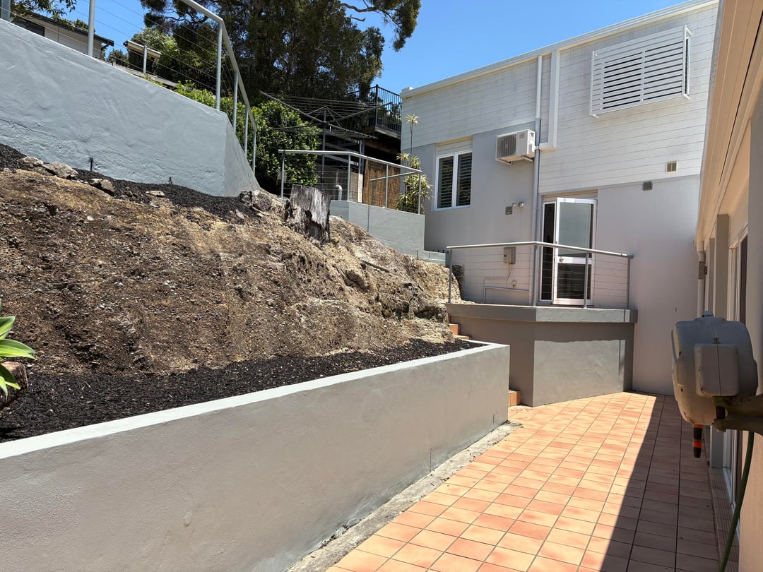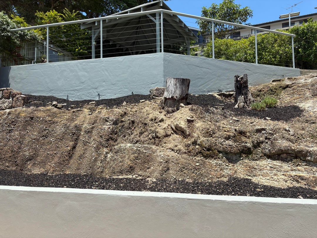 My first through was it could be a succulent garden with aloes, but since you’ve chosen natives that’s great. Some flowering spreading ground covers and grasses will be good in the steep area, plus some that can hang down over the lower wall. I’m imagining some bushy grevillias on the top part of the dirt mount that could grow up to the height of the fence, blocking some of the blue wall. Consider a replacement tree too in the stump zone.