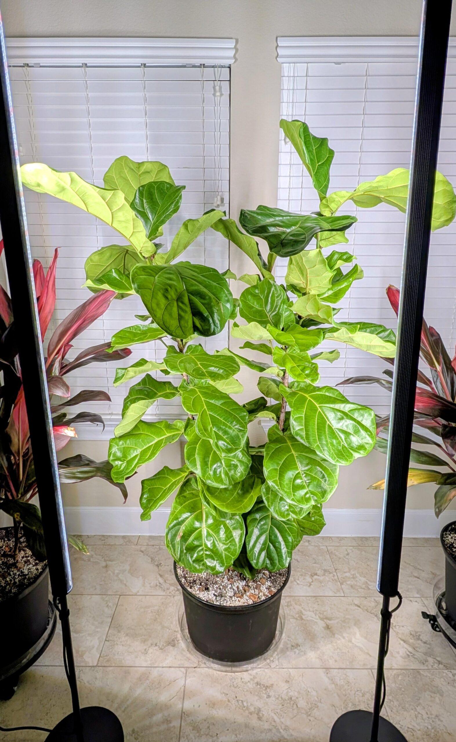 Bought Dublin at Costco 5 weeks ago for $30. Replanted from a 3 gallon pot to a 10 gallon pot 2 weeks ago. We didn't lose a single leaf. Instead, this guy is growing!. I think a lot of it has to do with the 2 Barrina TS1s.