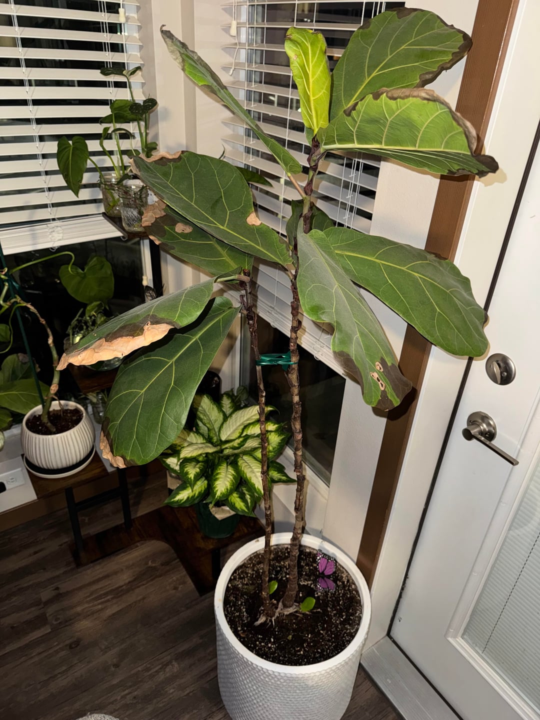 Issues – pot has no drainage, soil looks really wet and compact, tree is not infront of the window but to the side?