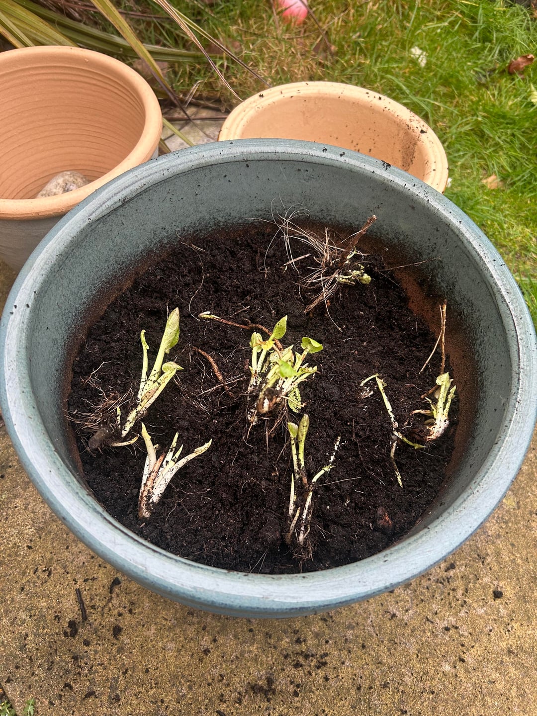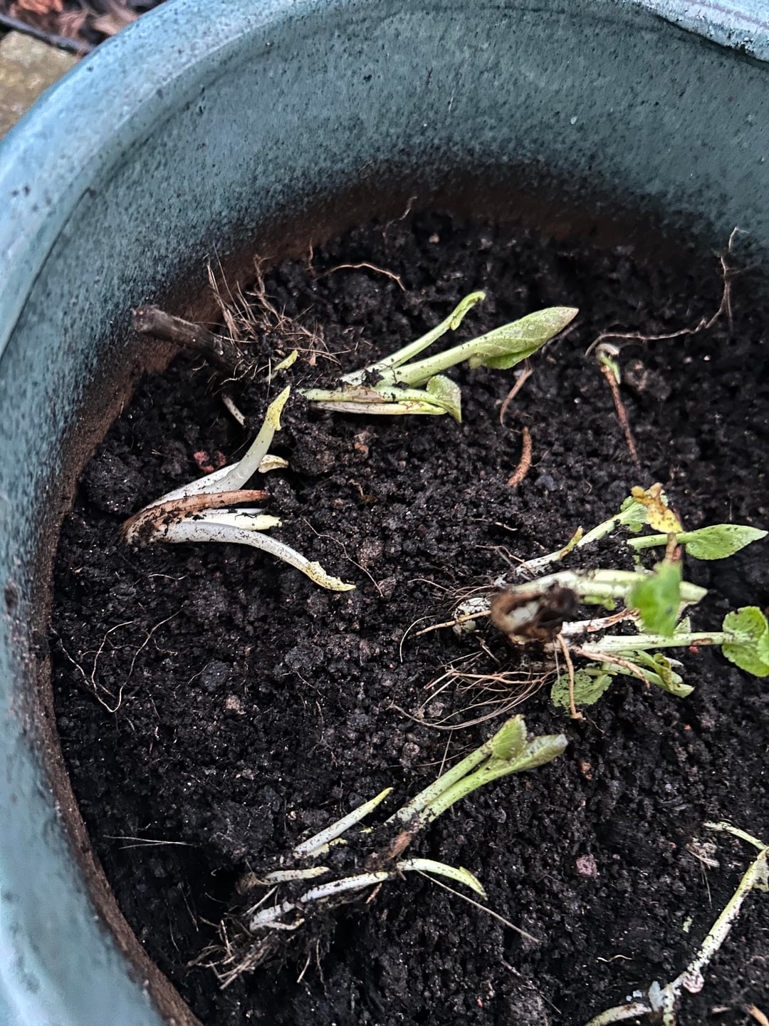 I was in the garden and noticed some sprouts and roots that looked as though they had previously been in a pot.