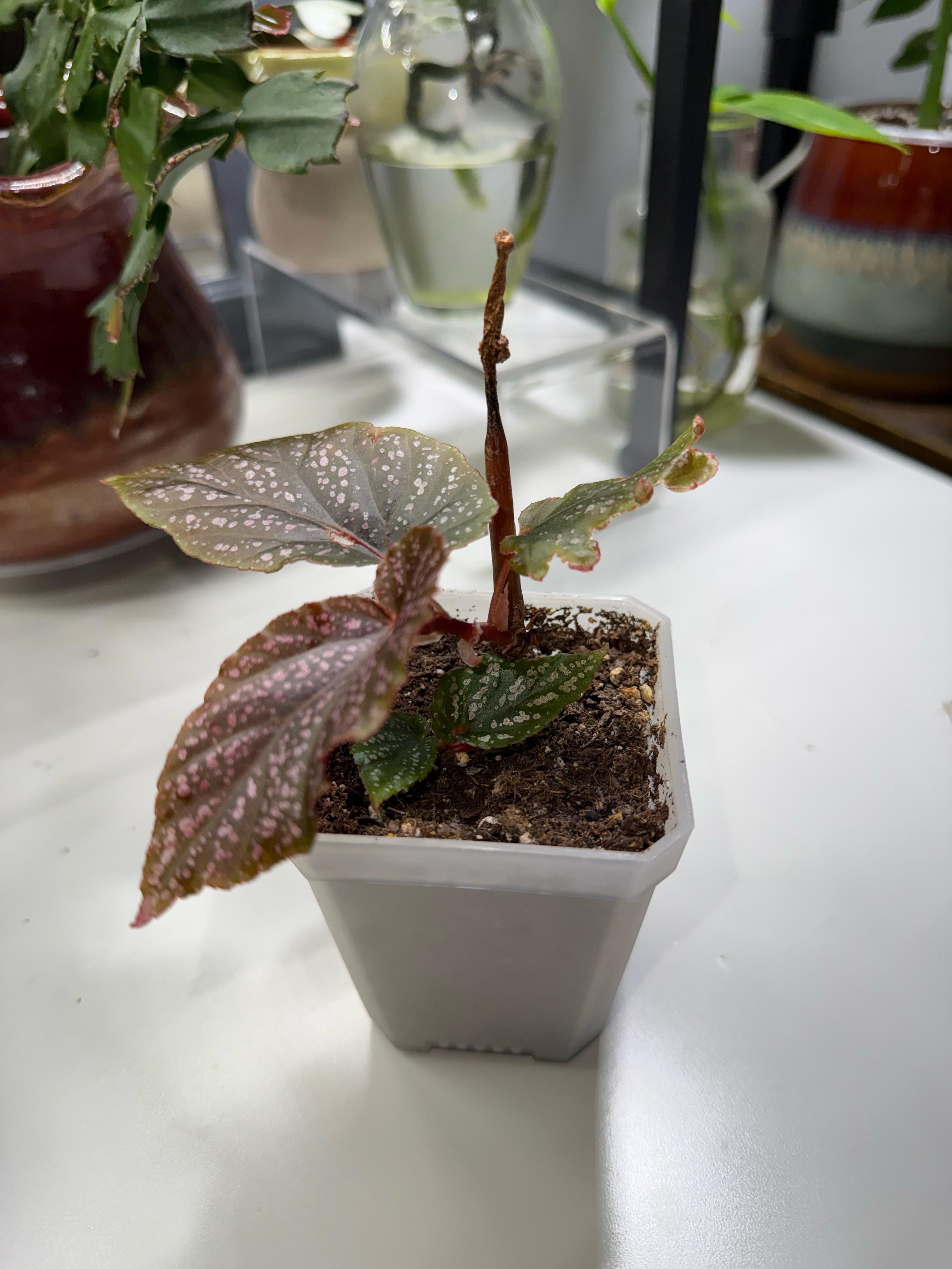 I bought a small begonia from a local seller at the end of November 2025 and on the way home I accidentally knocked all of the foliage off the top.😔 I knew she would grow back from the lower nodes and she absolutely has but now a few months later the stem above the node where the new growth came from is slowly withering down. I assume this is normal but I am not sure whether I should cut it off or if it will fall off on its own. Please help!! (this is my first begonia)
