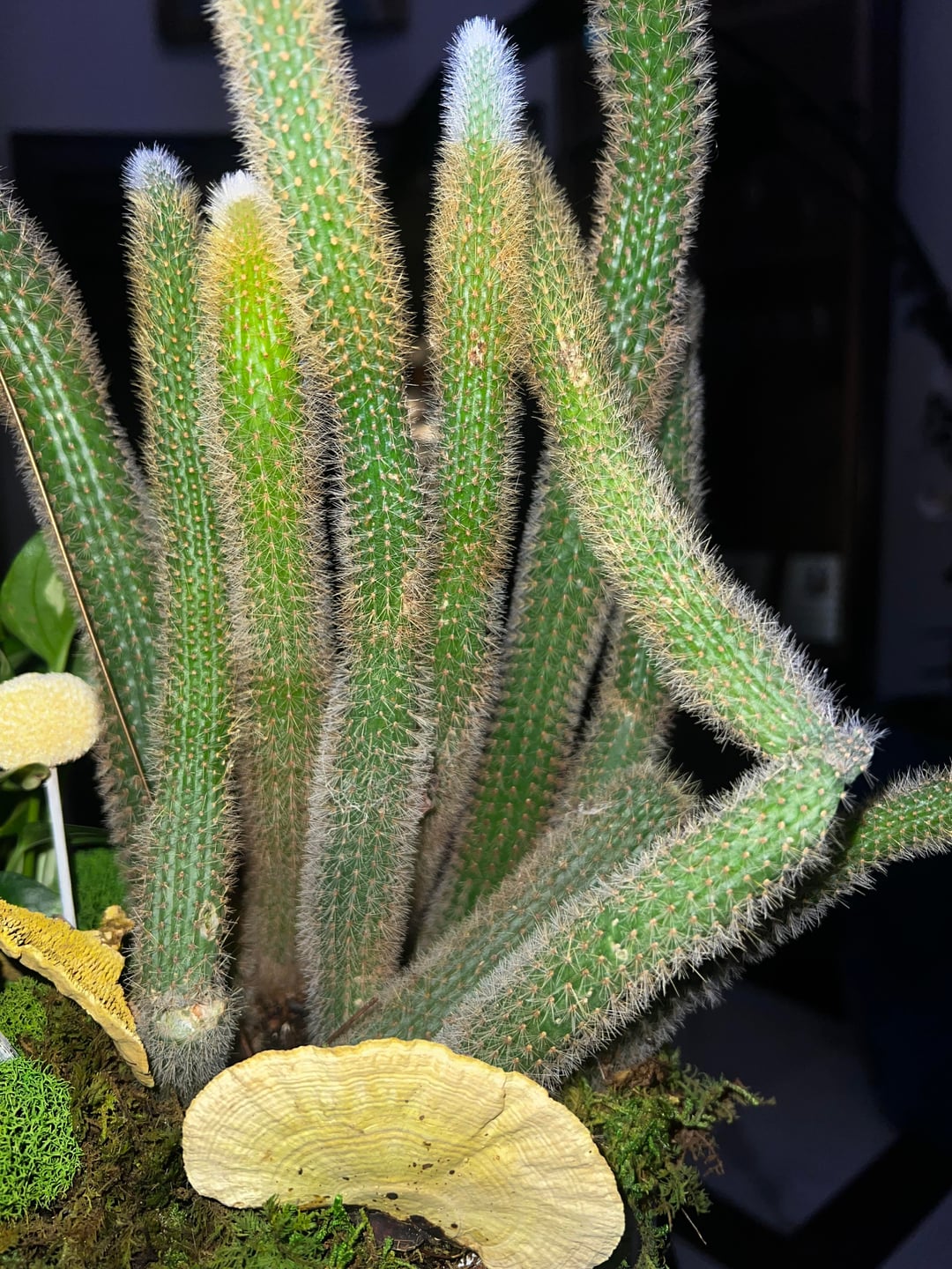 Cacti don’t belong in the same pot as moss and a pothos. They need to be in sandy, well-draining soil in a pot with a drainage hole. They need to get full sun, and to be watered infrequently, like once a month during the winter.