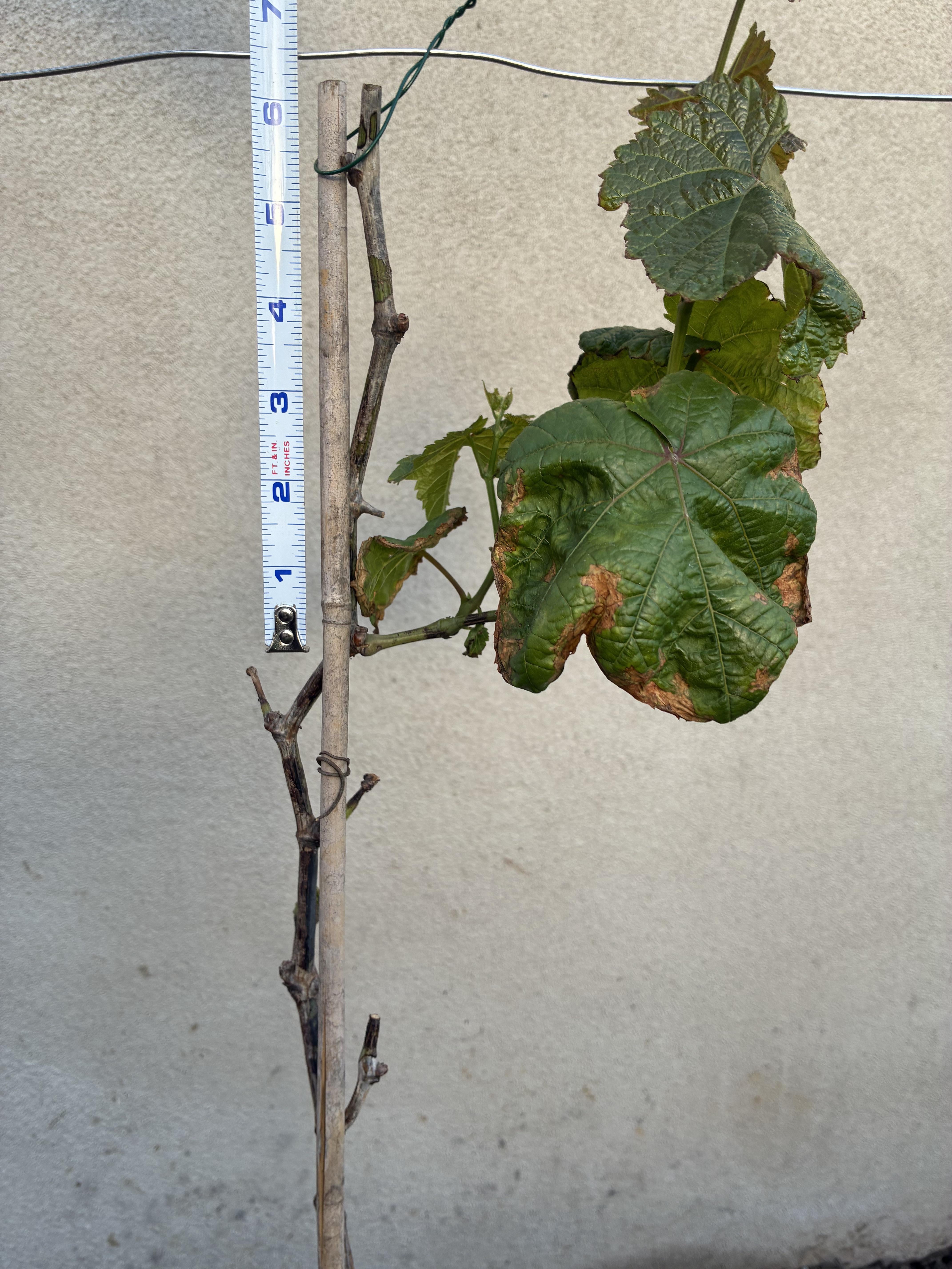 We have a young Ruby table grape and built a wire cordon system (2 tiers). So far, her only leafing branch is below our first wire. Do we prune that because the amount it has to reach for the wire would ultimately weaken it, or do we let it keep growing up to the wire?