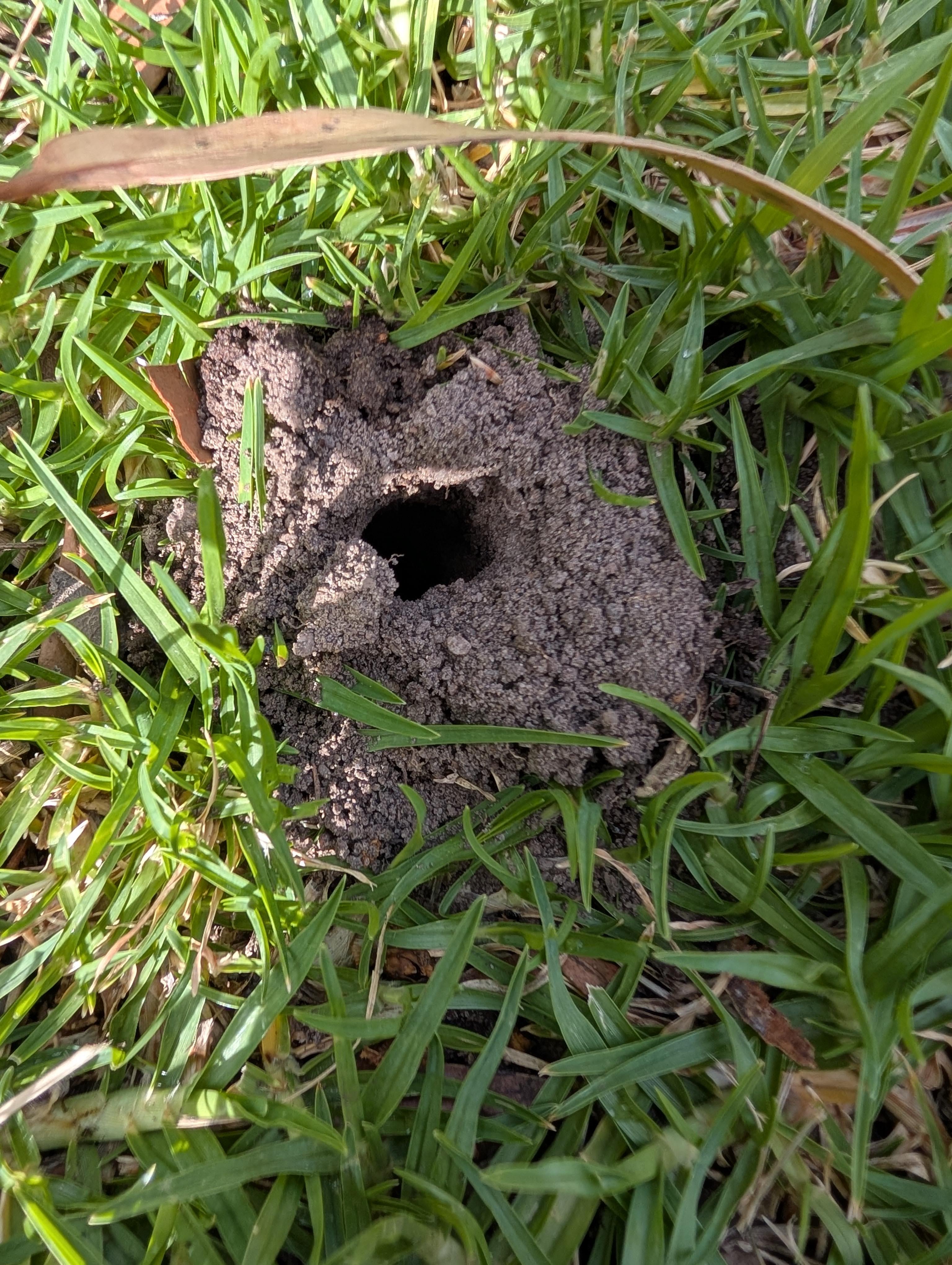 Hey guys! My son found this in our grass today, he thought it might be ants but I'm not sure and can't see any ants around. Anyone have any ideas of who has moved in?? Located in the western suburbs of Melbourne. by itsflic Gardening Australia 5 Comments puregalm 2 days ago Glory hole JohnWhambo 2 days ago What’s the girth? Are you near water? May be a yabbie hole? RavinKhamen 2 days ago nothing lives here. it is an exit hole of a cicada or beetle larva Fizzelen 2 days ago Oh, Jiminy Cricket’s PR_freak 2 days ago Have you tried knocking?