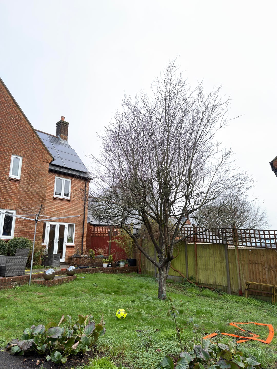It doesn’t look too large to me, it’s a good distance from any structures, and makes a nice centre point and I’m sure it’s a great feast for insects when in flower and birds when in fruit, even if the plums aren’t particularly palatable for you!