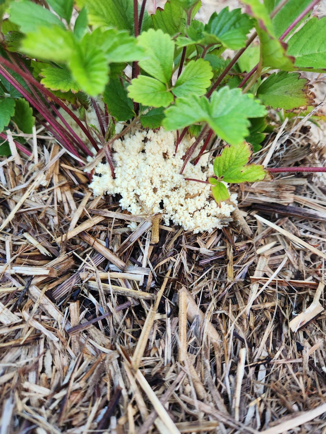 First time encountering something like this, found this morning at the base of two strawberry plants only. Looks so gross 🤢 is it a sign of bad things to come for my fruit and veg?