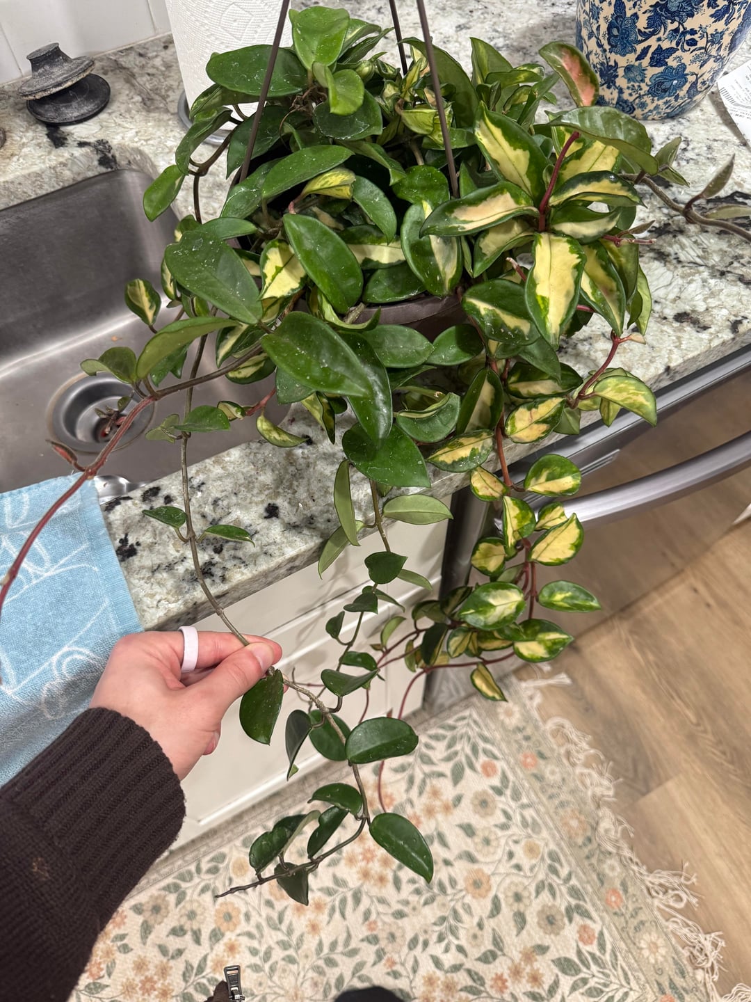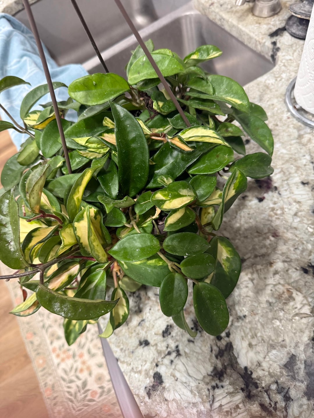 It’s hoya carnosa. It’s likely the basket was primarily the inner variegated hoya carnosa which is often referred to as Krimson Princess. Then some of the vines reverted to just carnosa without variegation. Pretty typical. You could separate them or leave them as is.