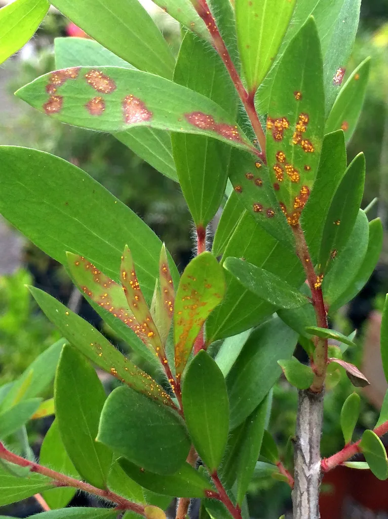 Myrtle rust spores spread by wind, insects, animals and sometimes on humans. It spreads rapidly and takes less than 2 weeks for the disease to settle into a plant. If spotted, your plant will need immediate attention. Once you see pustules, the infection is at its peak.