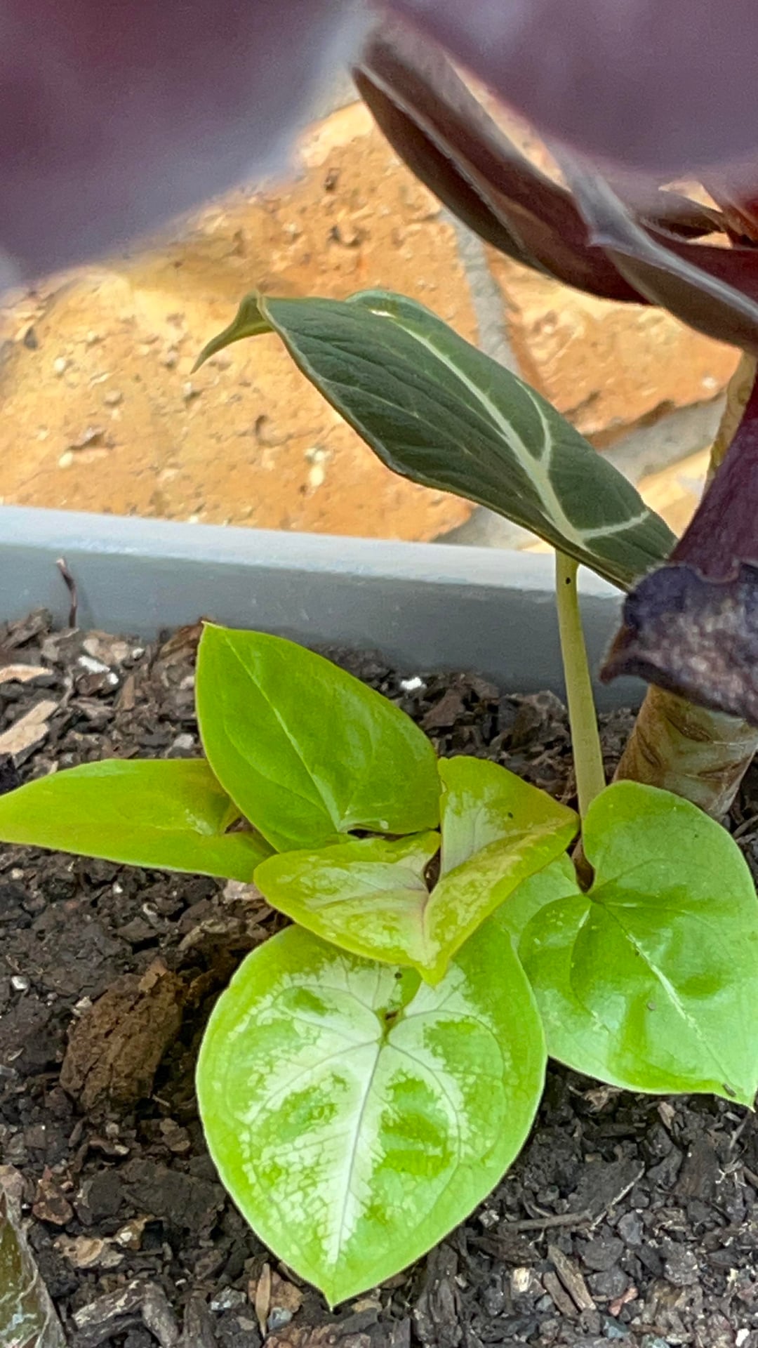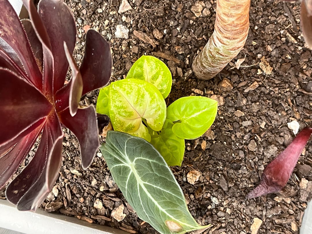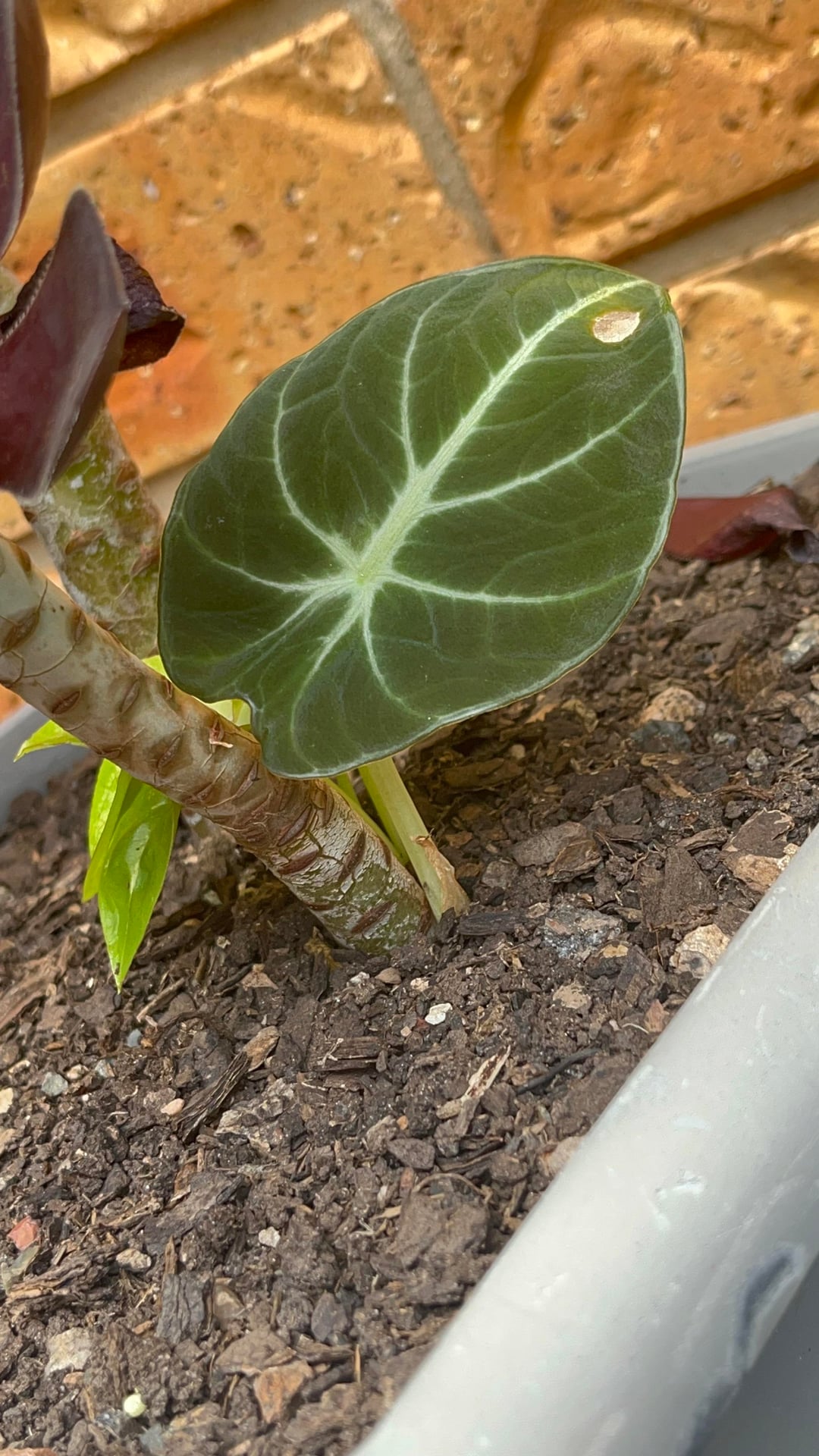 My brother bought her a terrarium about six years ago and it had an allocasias and syngoniums c and a couple other mixed plants. The alocasia was first to die, mum moved the syngoniums into there own pot, where they remained and grew for 5 years untill she got thrips in the house and they got her syngonium bad and she ended up removing it from the house Anyway…. 4 months later my brother put one of mum succulents into a pot And used the pot the syngonium use to be in. And fast forward to a few weeks ago (the start of this post )lol. So how did an alocasia and a syngonium BOTH pop up in a pot outside in up to 45° heat/bad winds and rain and be healthy and fine?It’s blowing my mind!!! 4 months after the the syngonium dies, it shows up again as a new plant in the same original pot.