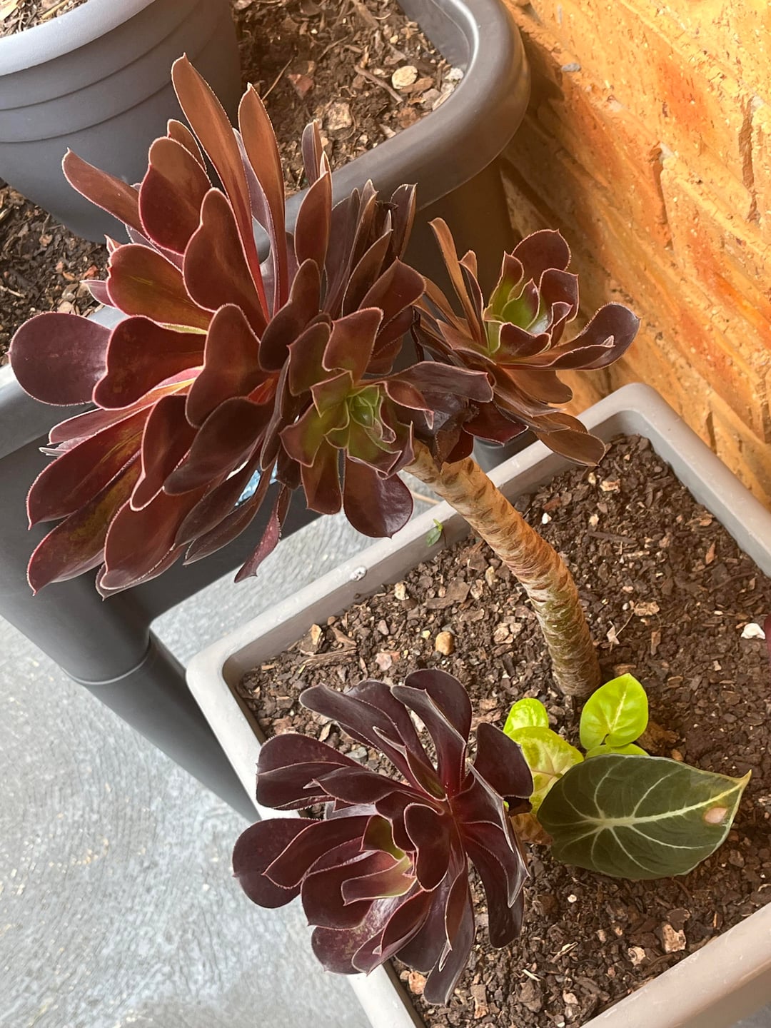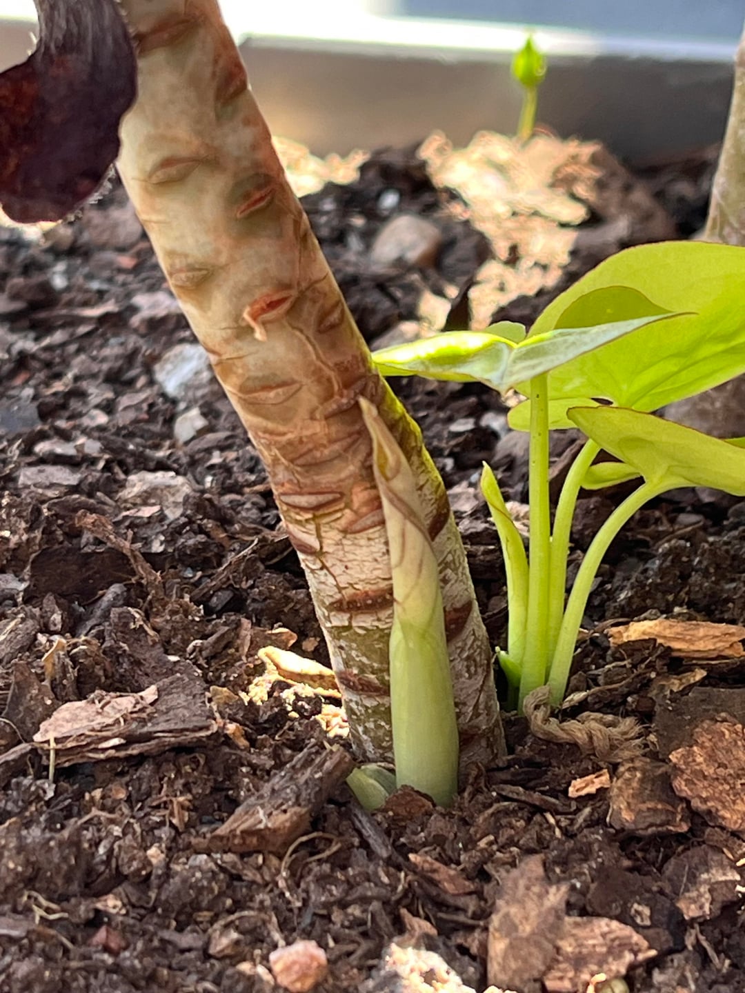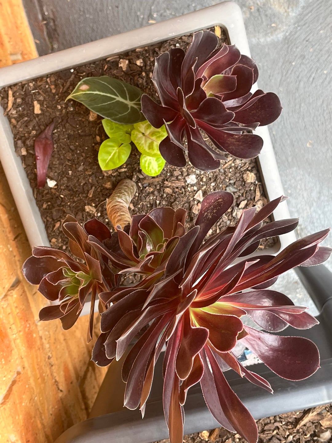 My brother bought her a terrarium about six years ago and it had an allocasias and syngoniums c and a couple other mixed plants. The alocasia was first to die, mum moved the syngoniums into there own pot, where they remained and grew for 5 years untill she got thrips in the house and they got her syngonium bad and she ended up removing it from the house Anyway…. 4 months later my brother put one of mum succulents into a pot And used the pot the syngonium use to be in. And fast forward to a few weeks ago (the start of this post )lol. So how did an alocasia and a syngonium BOTH pop up in a pot outside in up to 45° heat/bad winds and rain and be healthy and fine?It’s blowing my mind!!! 4 months after the the syngonium dies, it shows up again as a new plant in the same original pot.