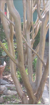 Above, grasses and winter blooms. Left, winter bed around trees. Below, bare crape myrtle.