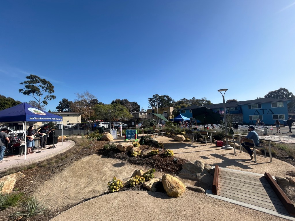 Two blue tents on Pardall Road on Thursday afternoon marked the Isla Vista Recreation and Park District’s opening ceremony of “Peaceful” Pardall Gardens, a newly renovated pocket of green space on Isla Vista’s busy thoroughfare.