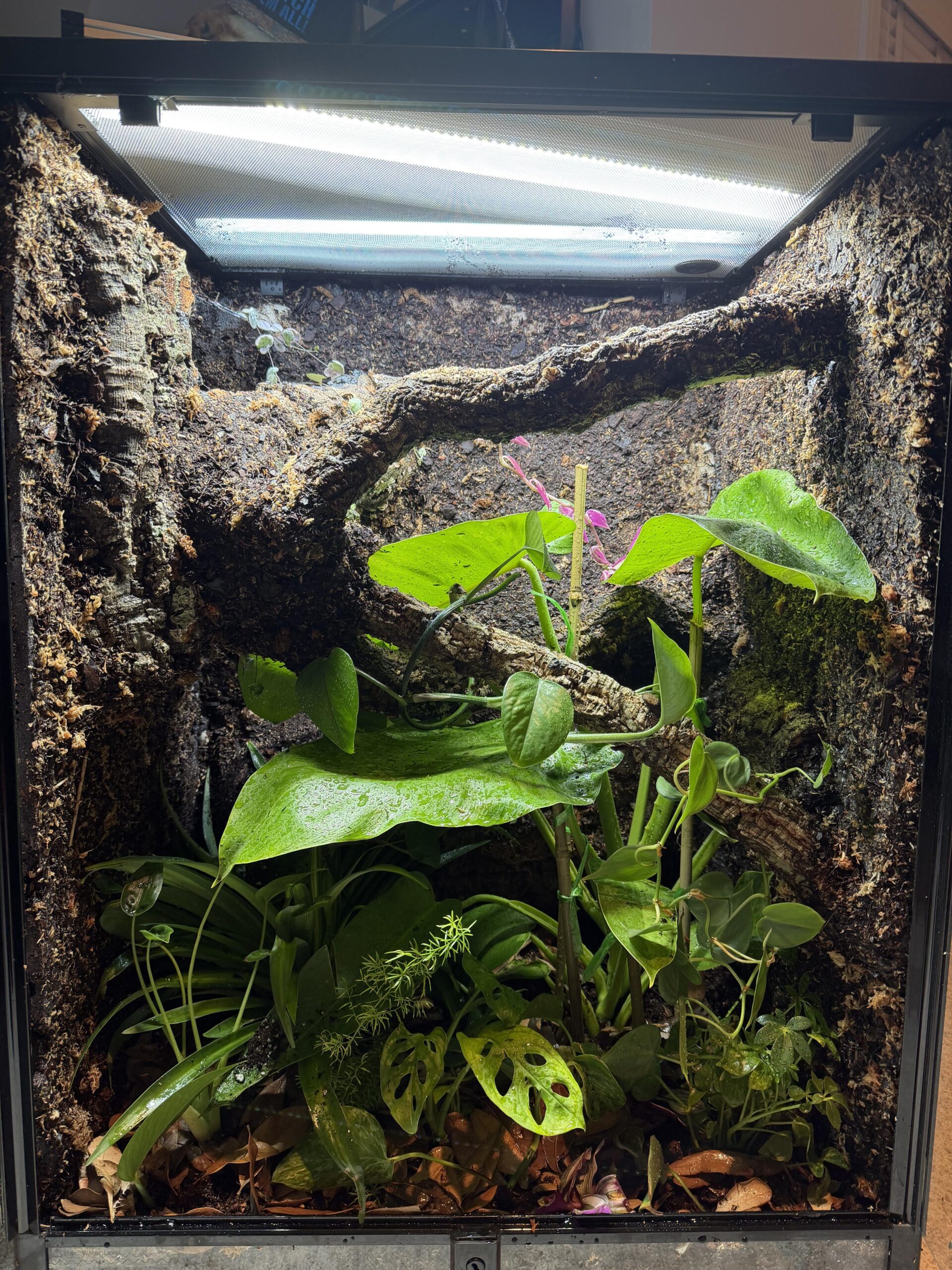 Just planted a new vivarium by MarketingOk5863 vivarium 1 Comment Appropriate_Cup8174 2 days ago I would throw a planter pot in that upper right corner and spray foam it. Then put a birds nest fern in it. But this looks great!