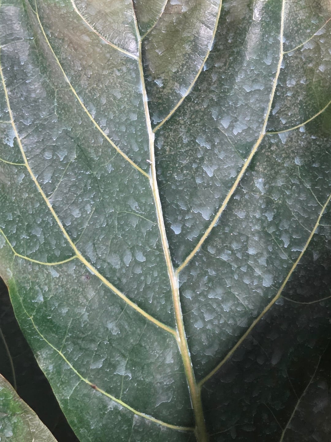 I bought a fiddle leaf fig plant from Costco 2 days ago. We placed it in an area with indirect sunlight. We also watered it after checking the soil was dry (we have hard water where I live). The plant isn't doing great 2 days later but what's worse is that we just notice bright blue powder on the leaves. We just wiped it down with a damp cloth after taking photos. Could someone confirm if the blue powder is some kind of pesticide/plant treatment residue or if it is mildew? I don't believe the blue powder was visible when we bought it, and it was healthy. One note is that our humidity is a little low (we had a humidifier running near the plant the night before). Thanks in advance!