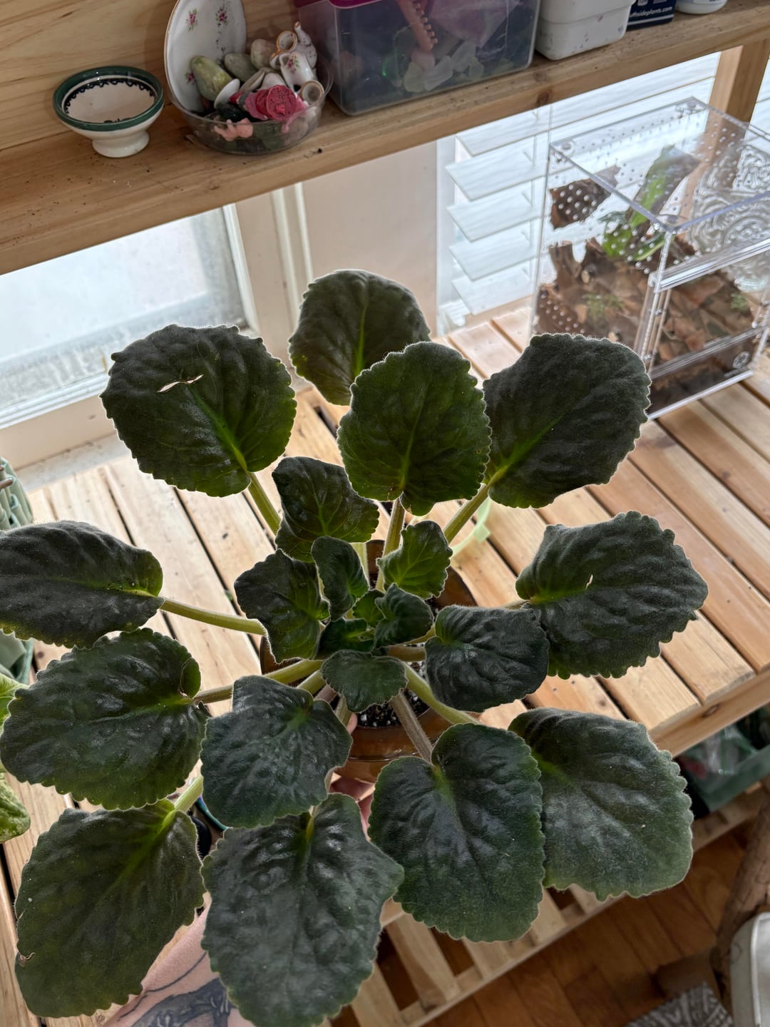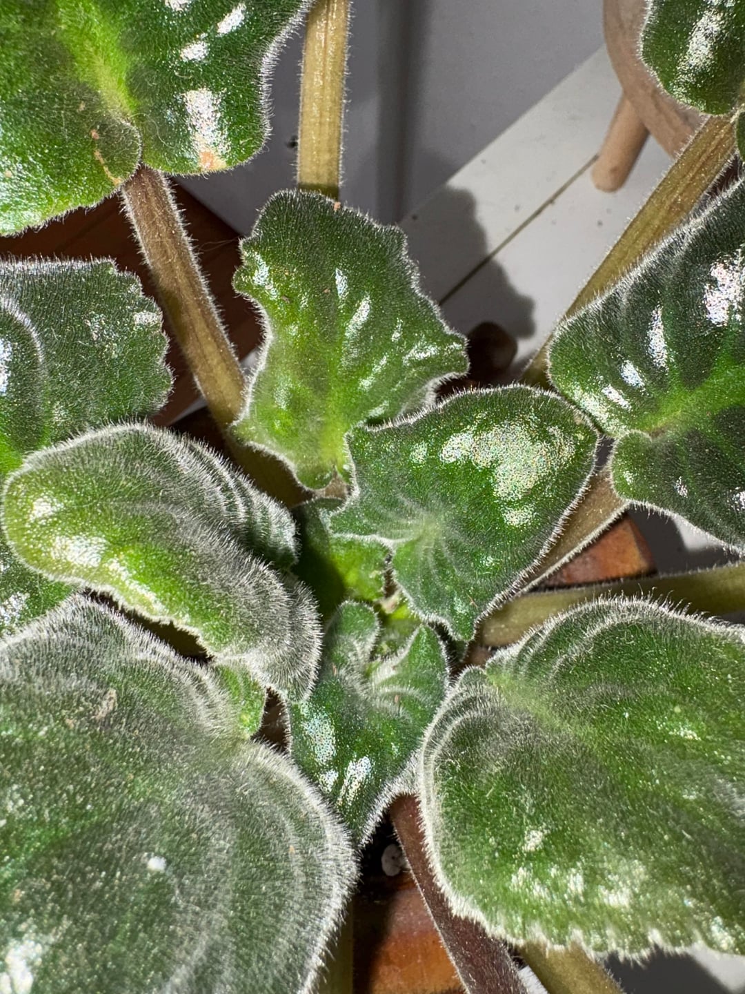 My favorite African violet has started to worry me. What do you think could be going on? It gets a fair amount of bright indirect light. It’s in a self watering pot and usually blooms like crazy. I’m scared it might be mites but have never dealt with them before. Any advice welcome. Thank you!