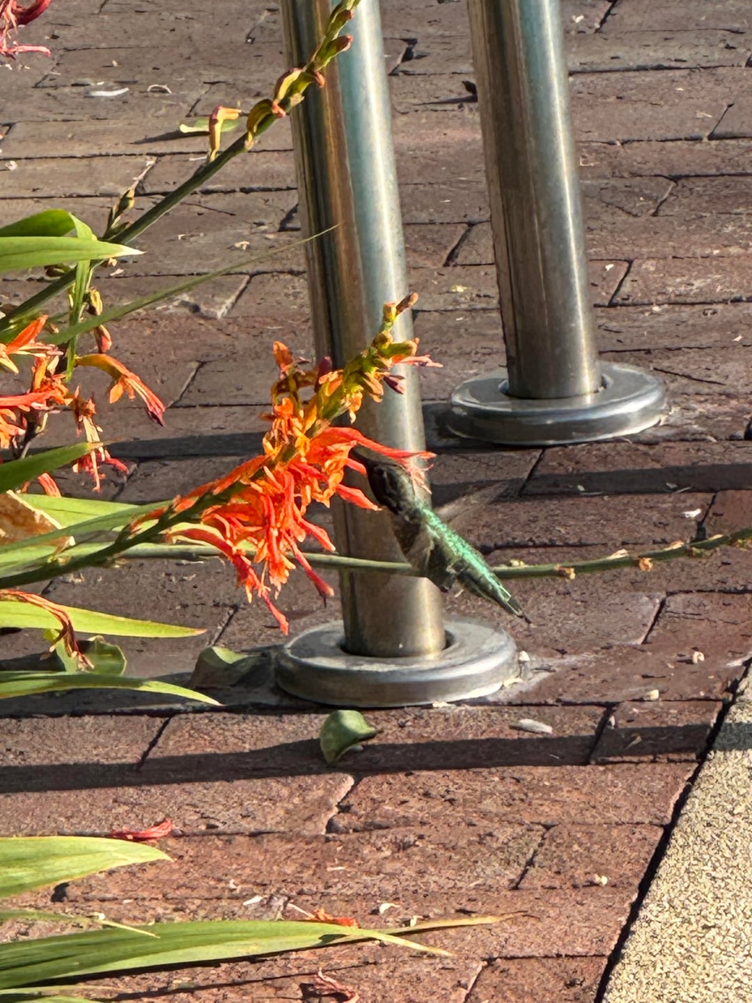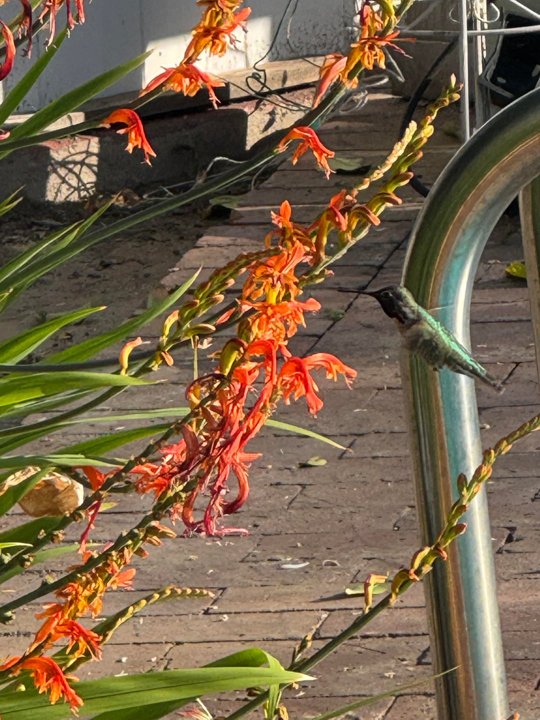 Hummingbirds and bees in Crocosmia patch