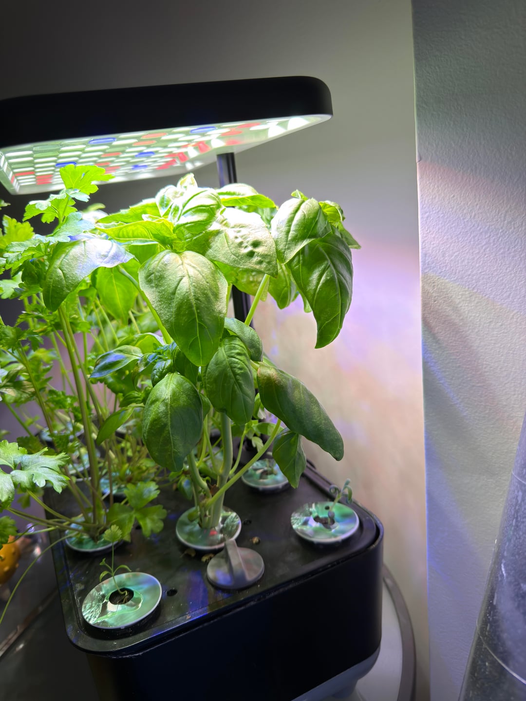 I am asking if I should trim the basil and parsley or remove some of the leaves to make space for the smaller plants. If there is any advice on how to do this properly I’d appreciate it. I tried to trim the basil already. But it really doesn’t seem like that made any difference at all.