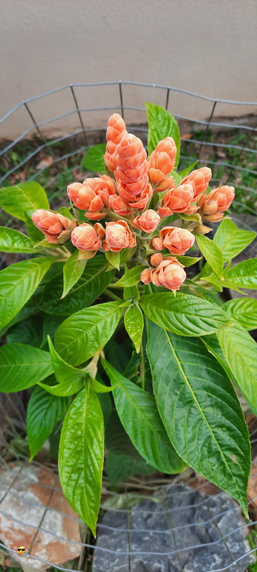 Per google: The orange shrimp plant (Justicia brandegeana) is a rare tropical perennial shrub with unique orange and pink tubular flowers that resemble shrimp. It can grow to 3′ x 3′ and produces blooms from spring through fall.