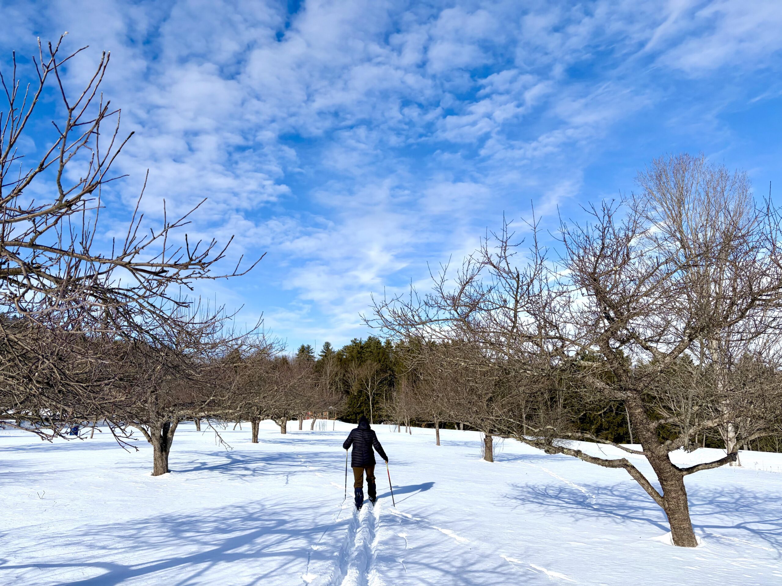 We surveyed our no spray orchard today on skis to plan our annual pruning which will start as soon as some of the snow melts (usually in late March) . We have 2 dozen trees , apples, peaches, and pears all grown on standard root stock. It’s a ritual I look forward to. We are still enjoying lasts years apples stored at 34 degrees F.